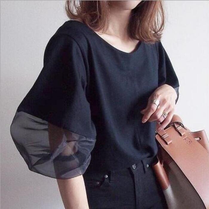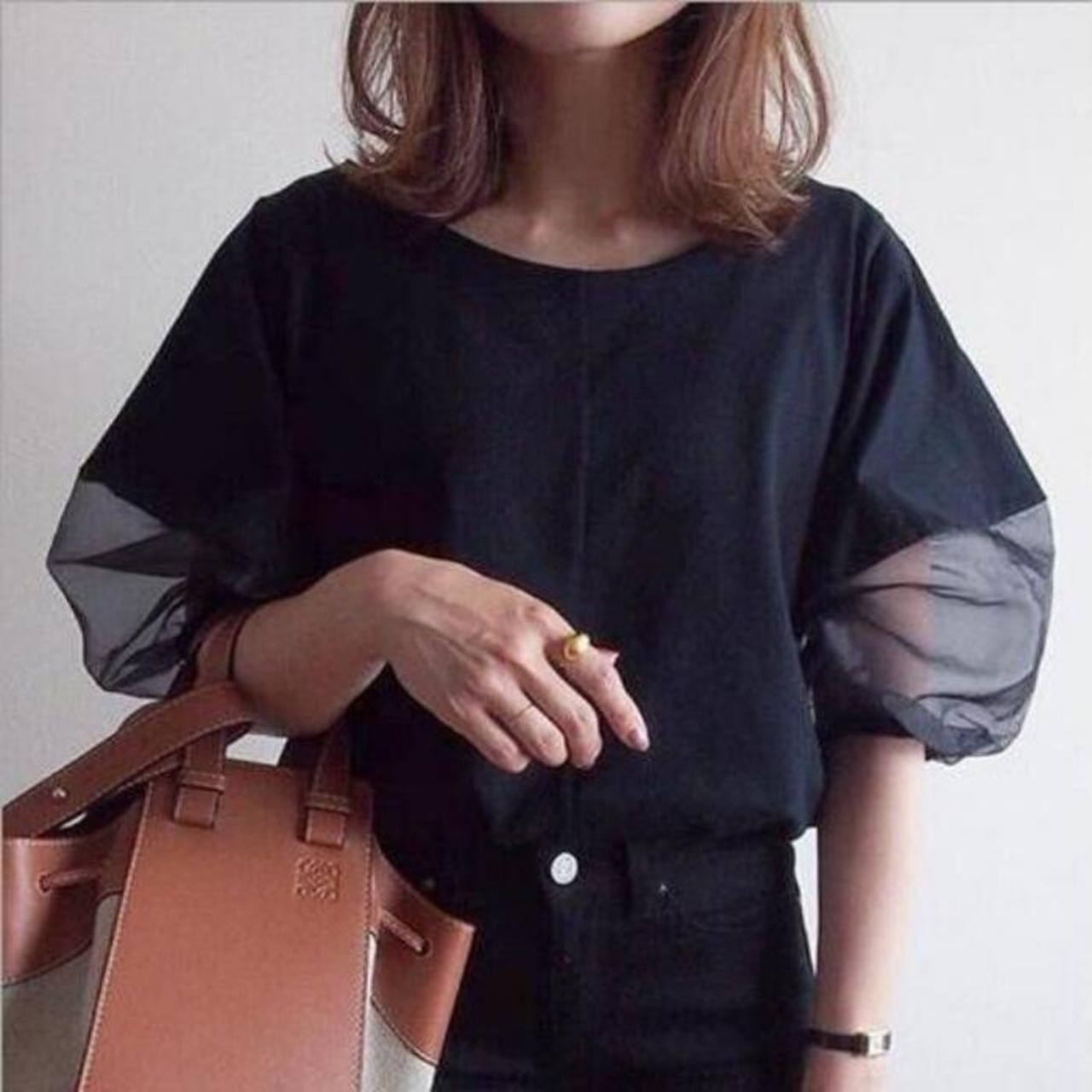トップス ブラウス Tシャツ パフスリーブ シアー 透け感 レディース エレガント きれいめ 五分袖 カジュアル ラウンドネック おしゃれ 大人 可愛い フェミニン シンプル ブラック 黒 春 夏 秋 20代 30代 40代 50代