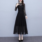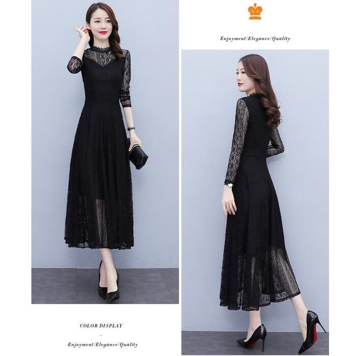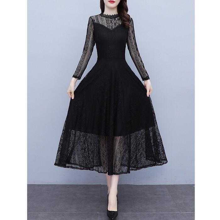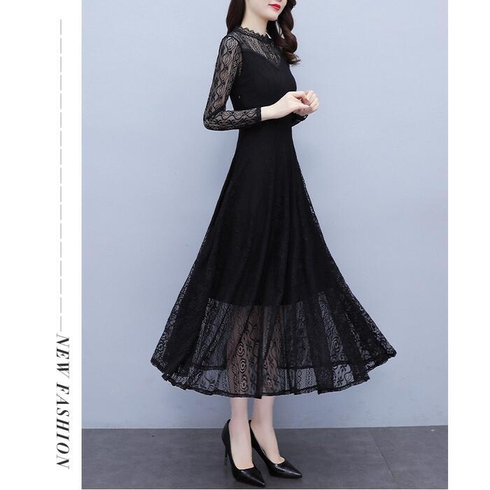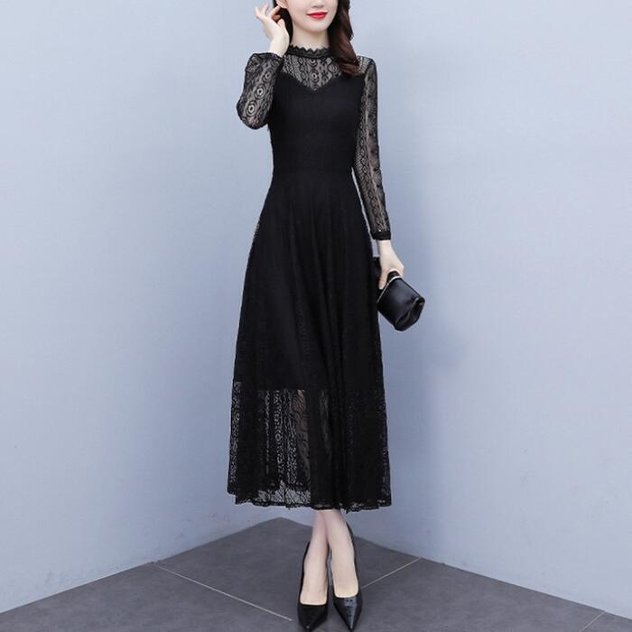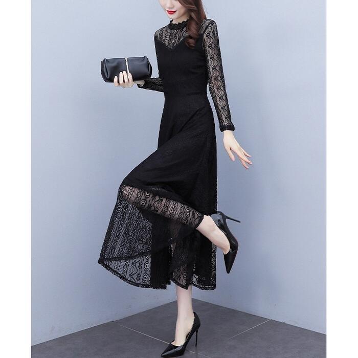 大きいサイズパーティードレス ワンピース 結婚式 お呼ばれ ミモレ丈 袖あり フォーマル 長袖 レース エレガント レディース ワンピ きれいめ 二次会 セレモニー フェミニン 透け感 ハイウエスト ブラック 黒 春 秋 夏 20代 30代 40代 50代