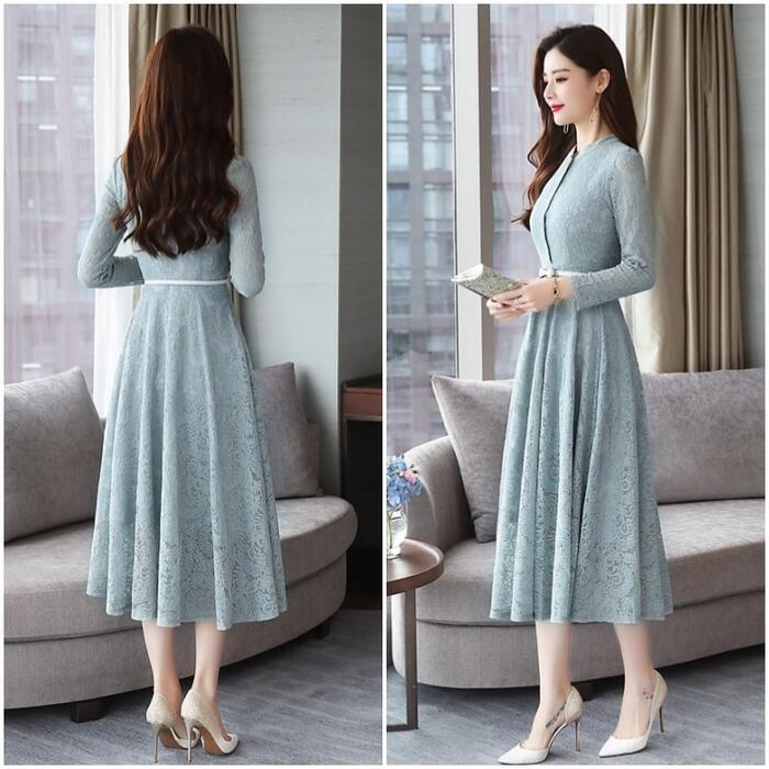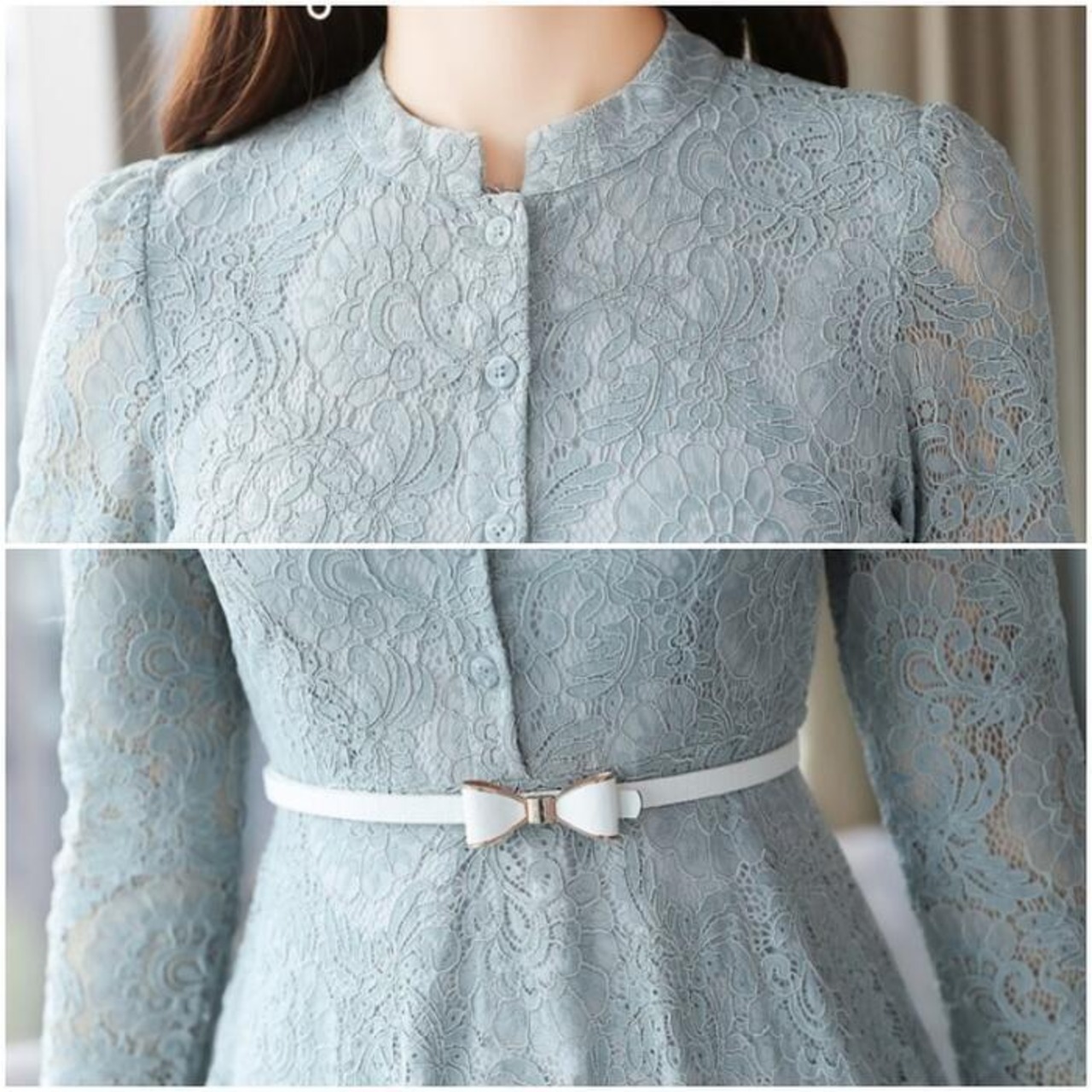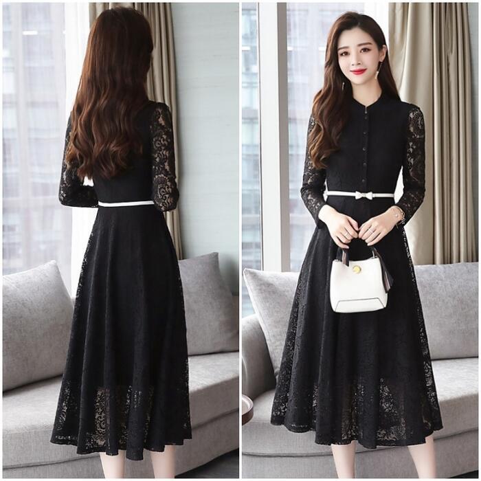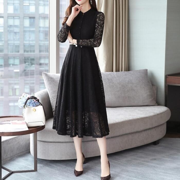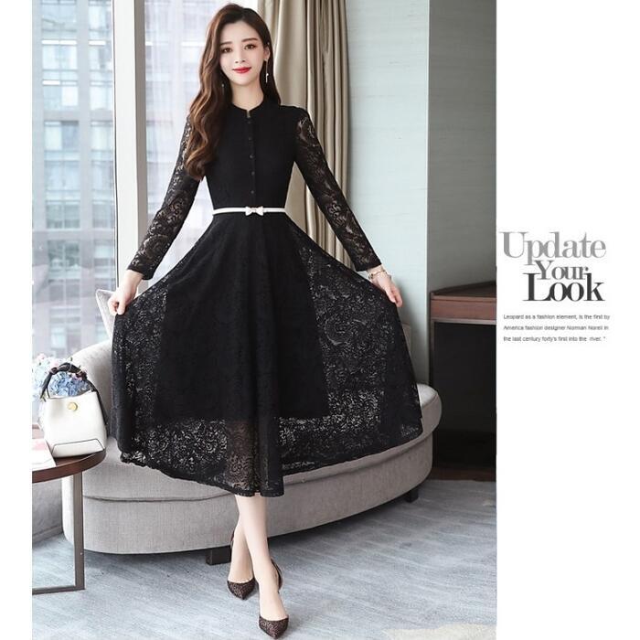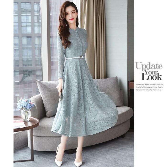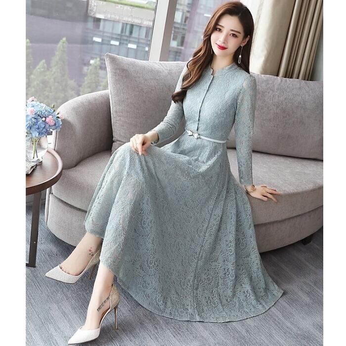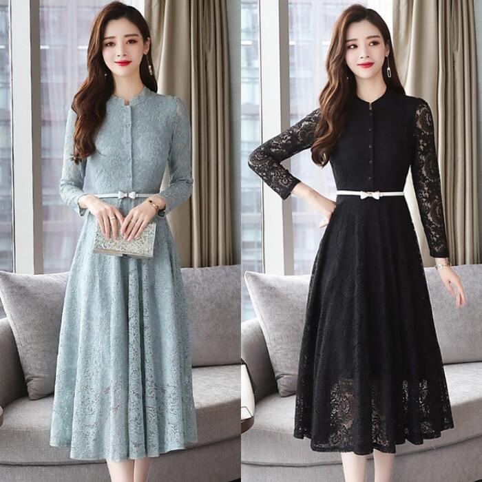 全2色 大きいサイズ スタンドカラーパーティードレス ワンピース 結婚式 お呼ばれ ミモレ丈 袖あり フォーマル 長袖 レース エレガント レディース ワンピ きれいめ 二次会 セレモニー フェミニン 透け感 ハイウエスト ブルー グレー ブラック 黒 春 秋 夏 20代 30代 40代 50代