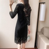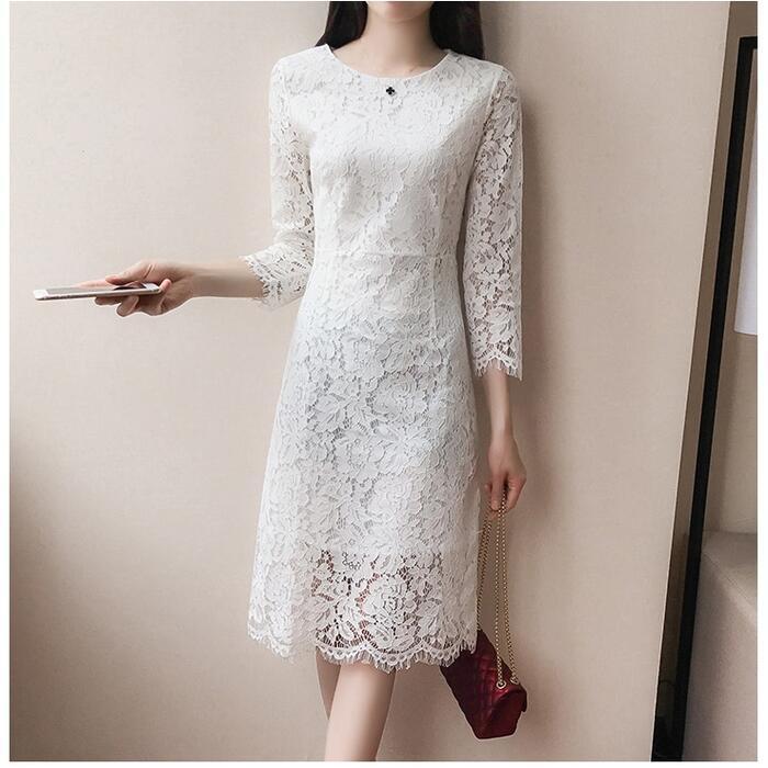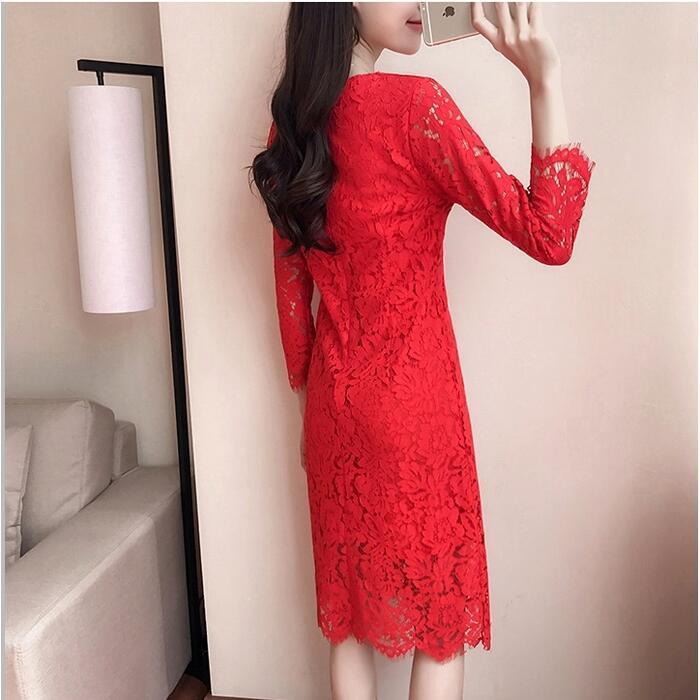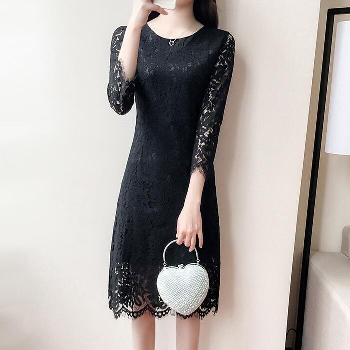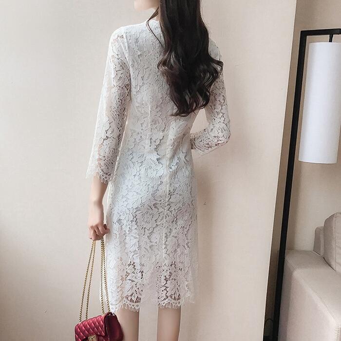 全3色 大きいサイズパーティードレス ワンピース 結婚式 お呼ばれ ひざ丈 袖あり フォーマル 七分袖 レース エレガント レディース ワンピ きれいめ 二次会 セレモニー フェミニン 透け感 タイト レッド 赤 ホワイト 白 ブラック 黒 春 秋 夏 20代 30代 40代 50代