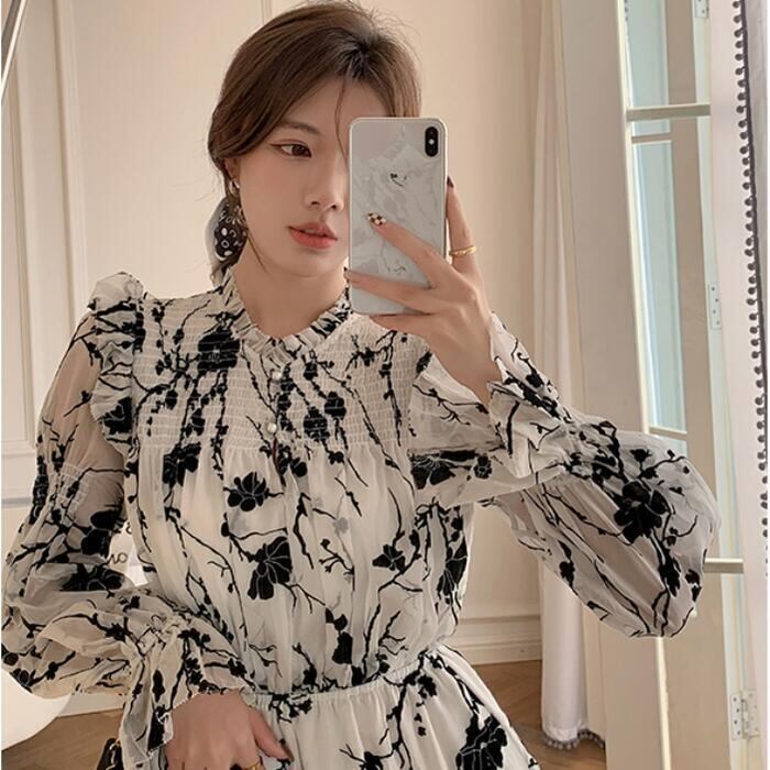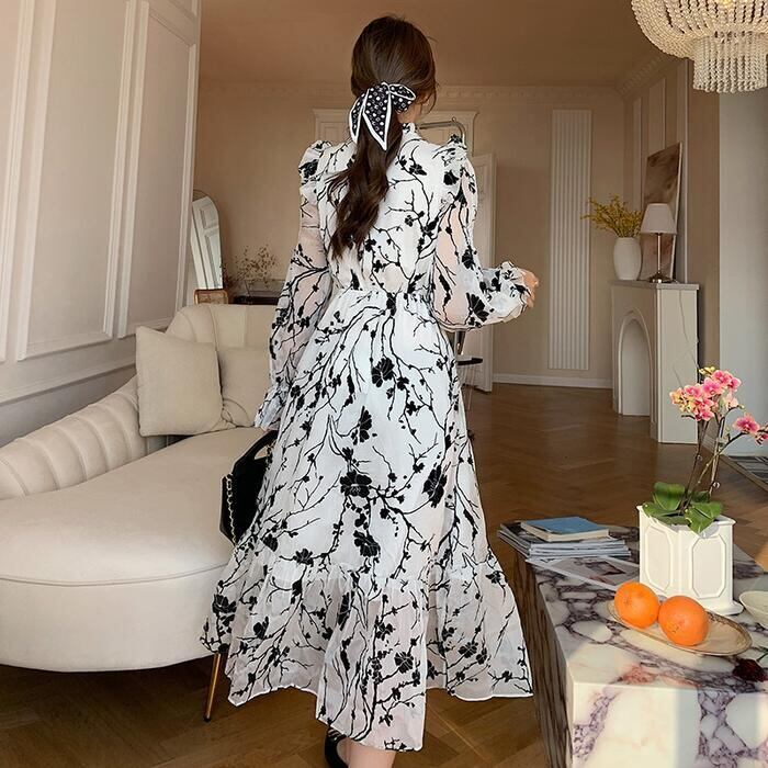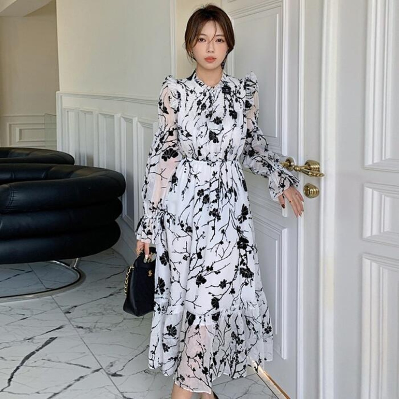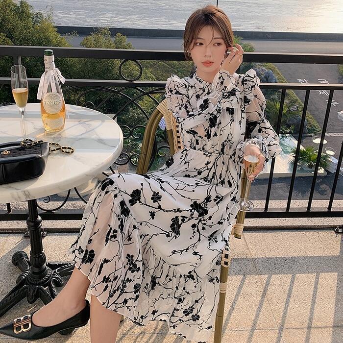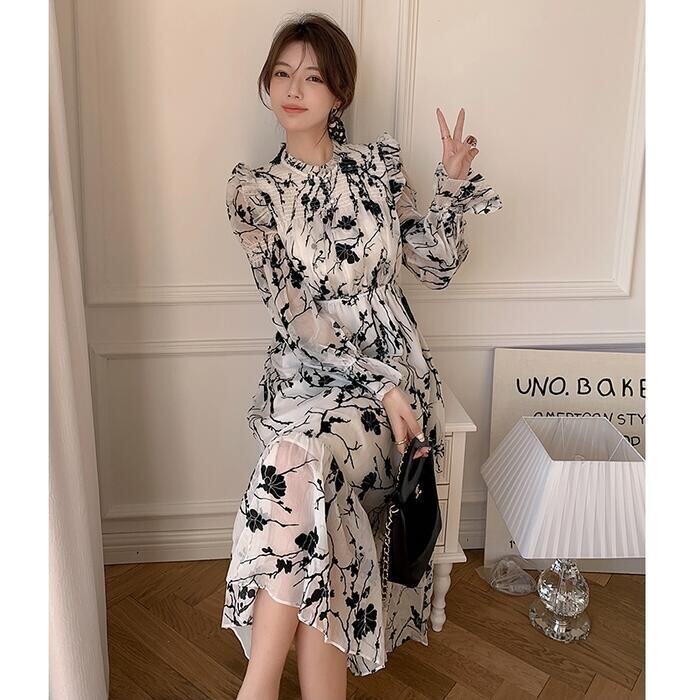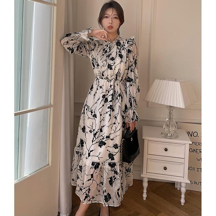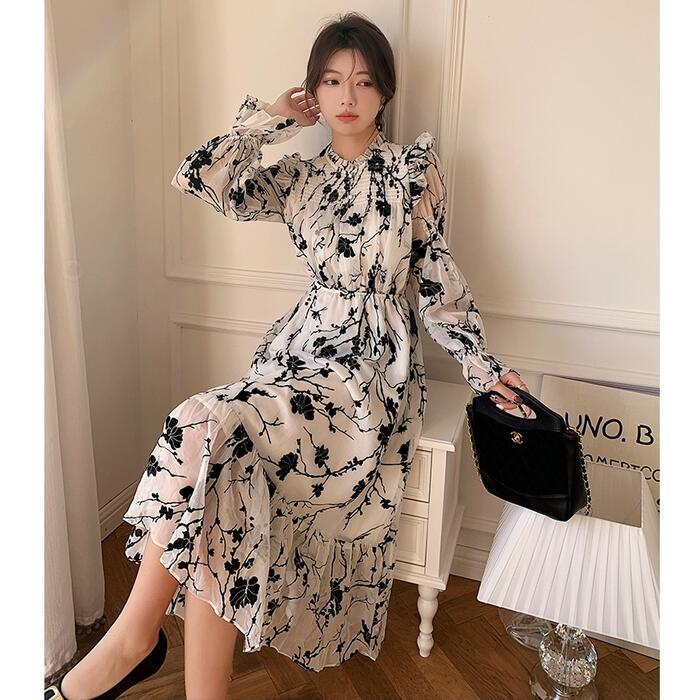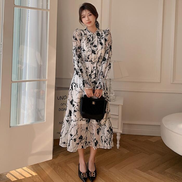 大人っぽい雰囲気漂うシックな花柄ワンピース。