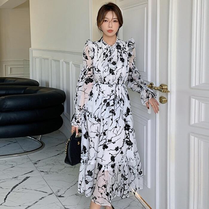 大きいサイズワンピース ティアード フリル 花柄 シアー ロングワンピ おしゃれ 袖あり ミモレ丈 長袖 カジュアル レディース ワンピ ドレス きれいめ 体型カバー 透け感 レトロ 大人 可愛い ホワイト 白 春 夏 秋 20代 30代 40代 50代