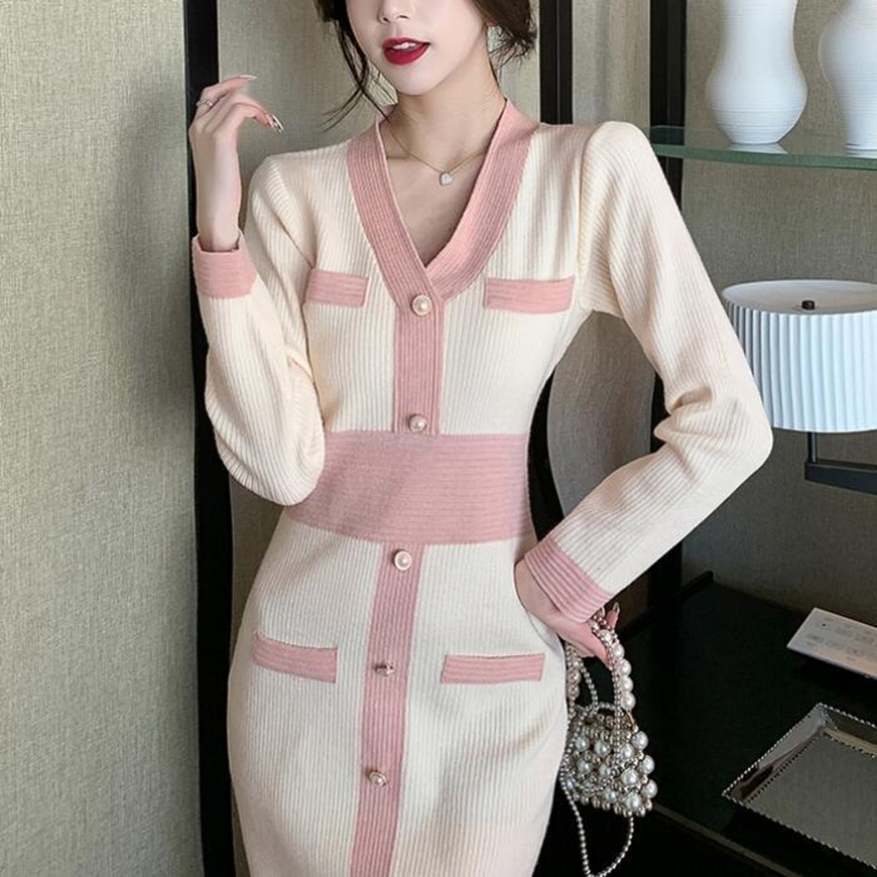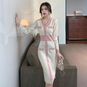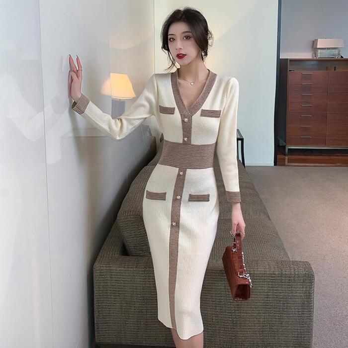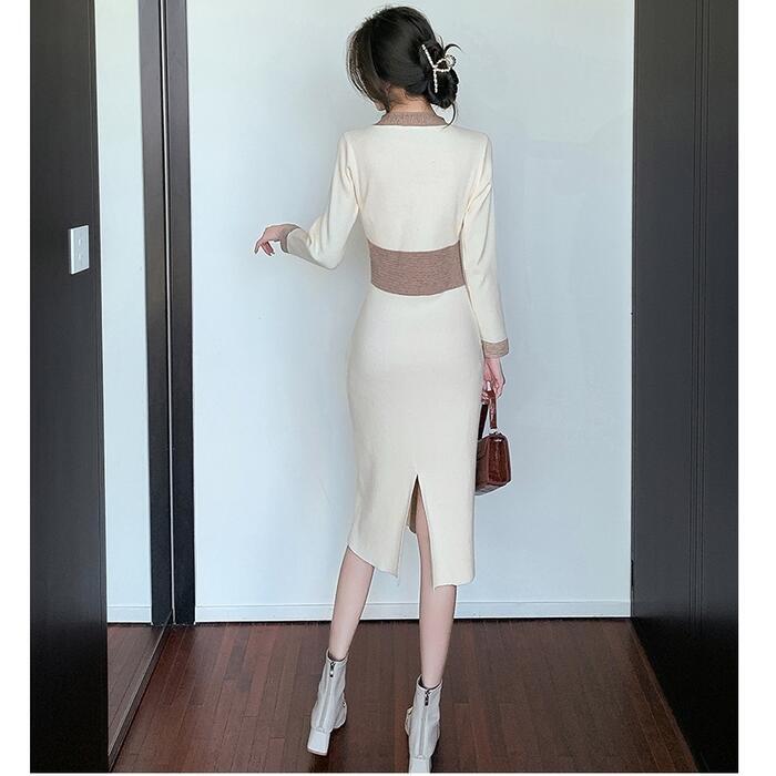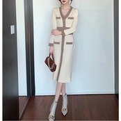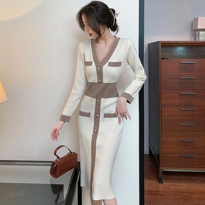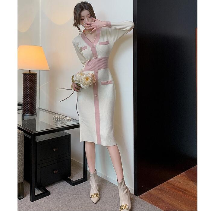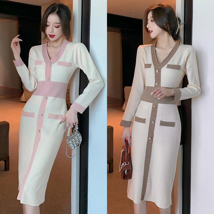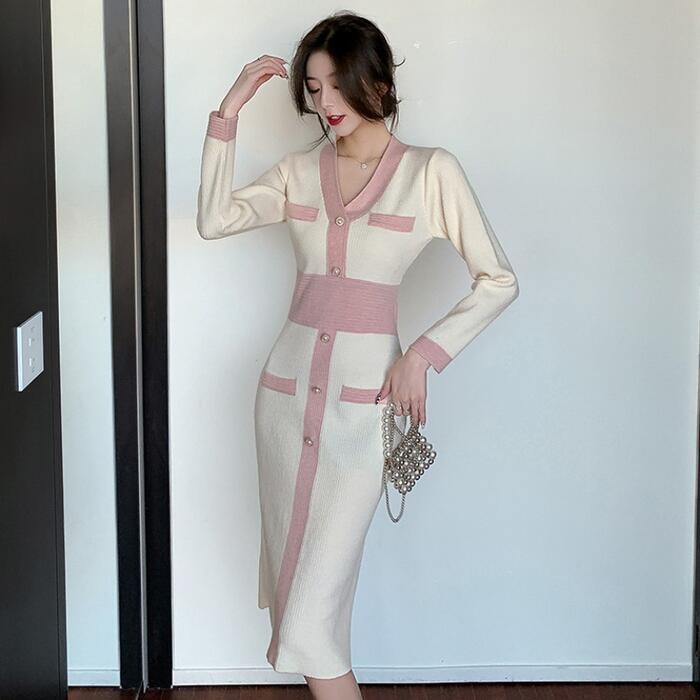 全2色 ワンピース ニット バイカラー Vネック ロングワンピ おしゃれ 袖あり ミモレ丈 長袖 切り替え カジュアル レディース ワンピ ドレス きれいめ タイト エレガント 大人 可愛い ベージュ ピンク ブラウン 春 冬 秋 20代 30代 40代 50代