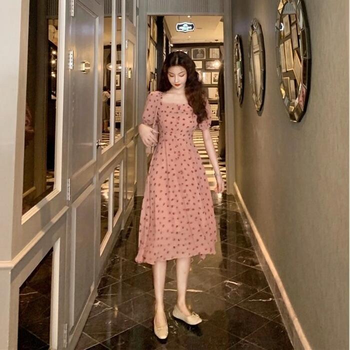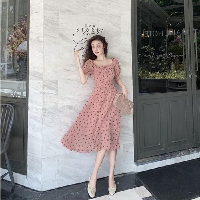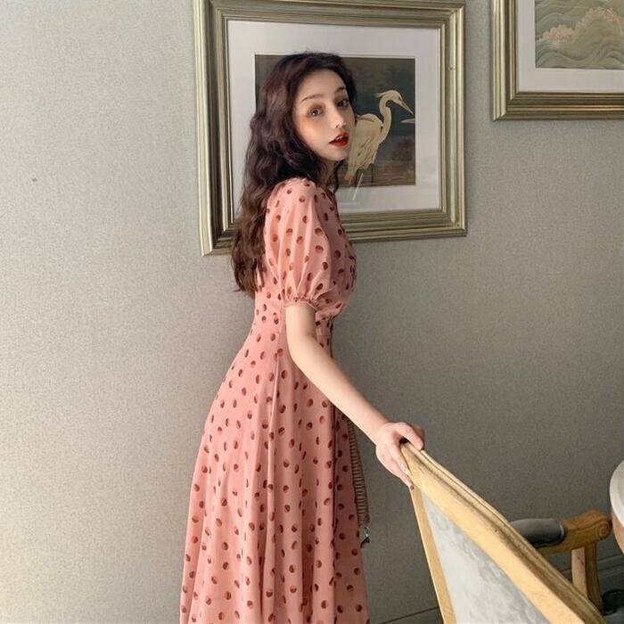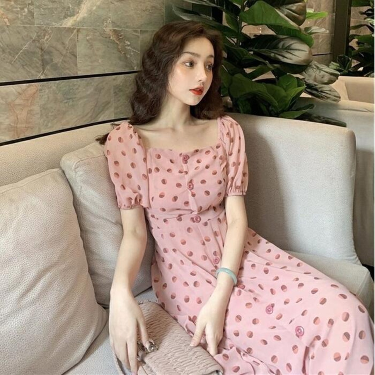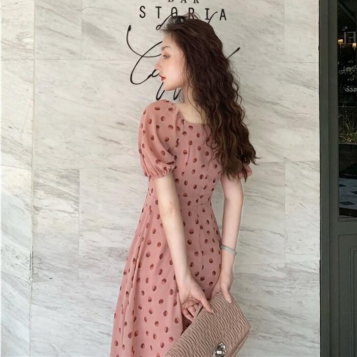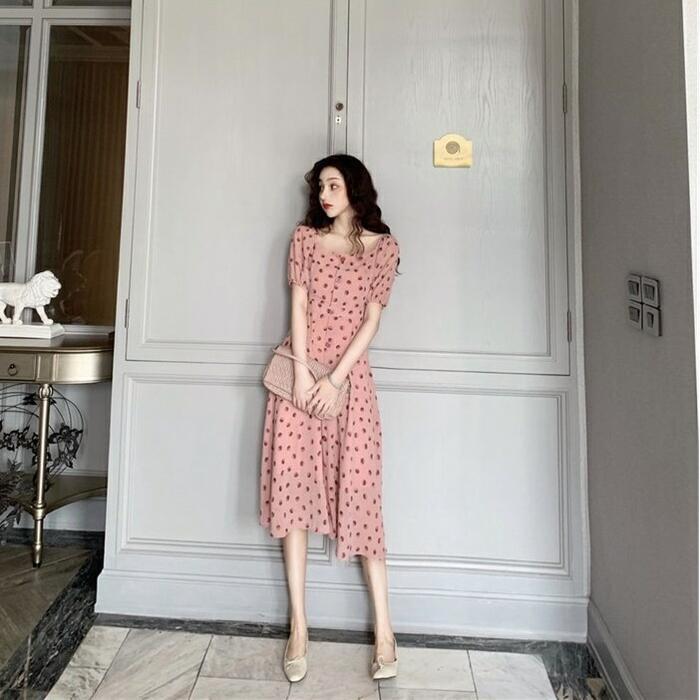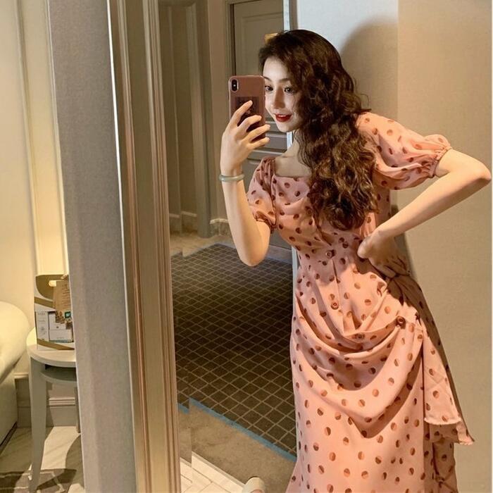大きいサイズ ワンピース パフスリーブ ドット柄 ロングワンピ おしゃれ 袖あり ひざ丈 半袖 カジュアル レディース ワンピ ドレス きれいめ スクエアネック ハイウエスト クラシカル 大人 可愛い ピンク 春 夏 秋 20代 30代 40代 50代