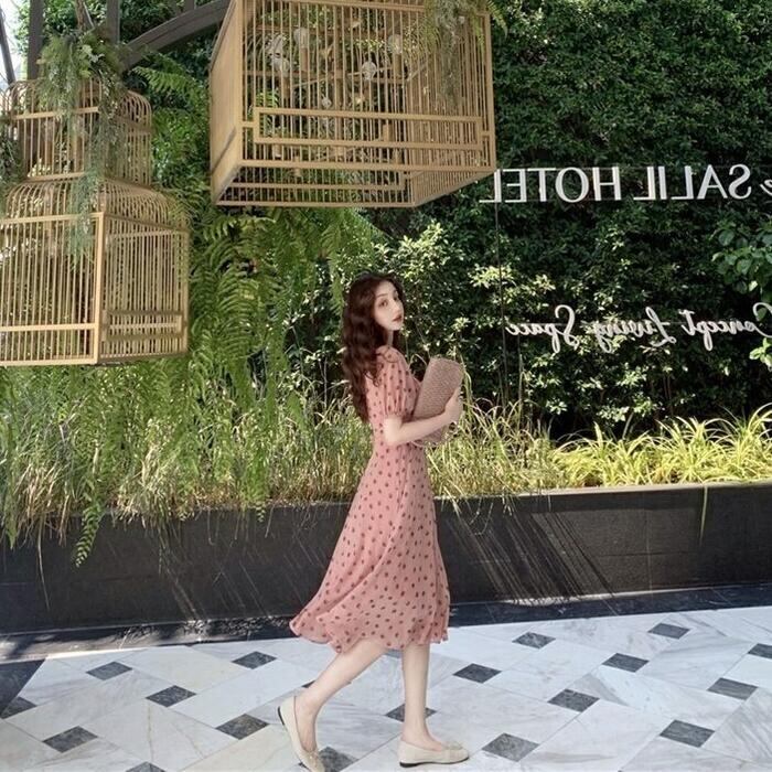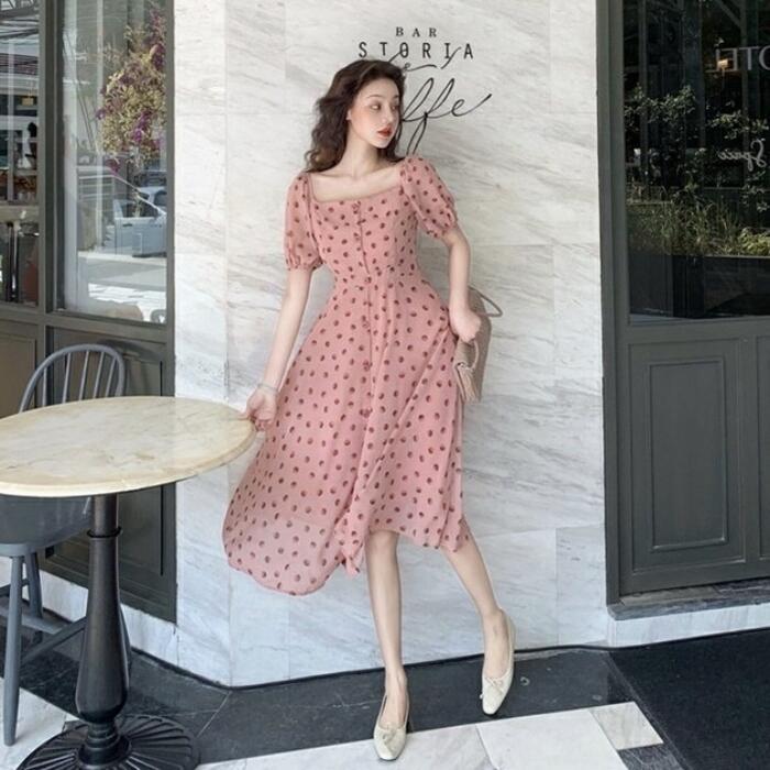 ふんわりしたパフスリーブとくすみピンクがスイートなドット柄ワンピース。