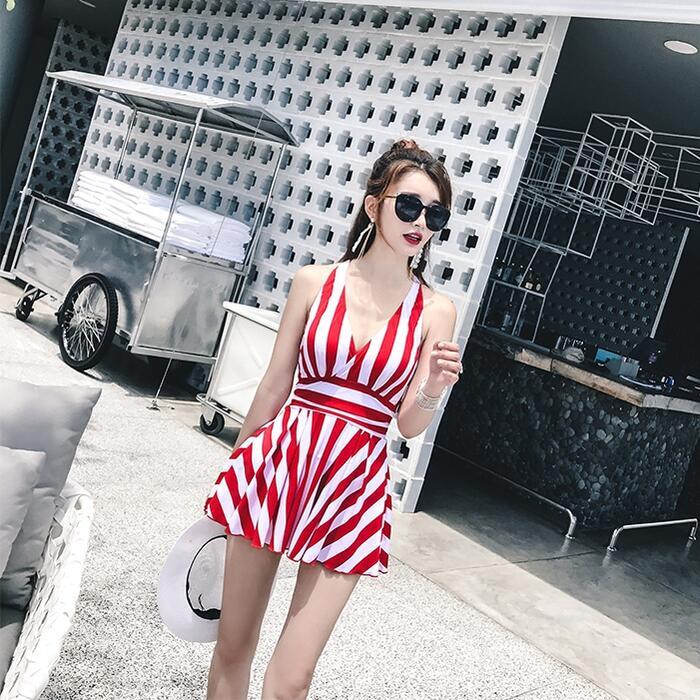 全2色 レディース 水着 ワンピース おしゃれ スイムウェア ストライプ柄 体形カバー ホルターネック レトロ エレガント バイカラー リゾート 海 プール 夏 フェミニン きれいめ 大人 可愛い 大きいサイズ ブラック 黒 レッド 赤 20代 30代 40代 50代