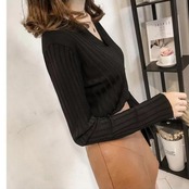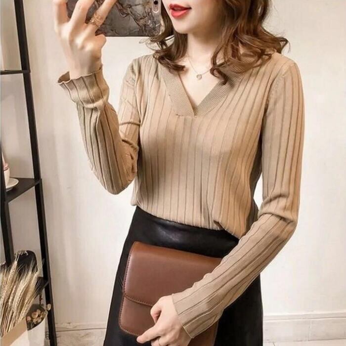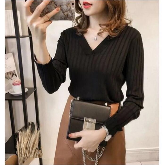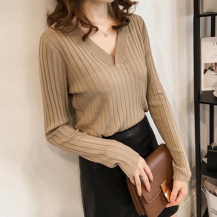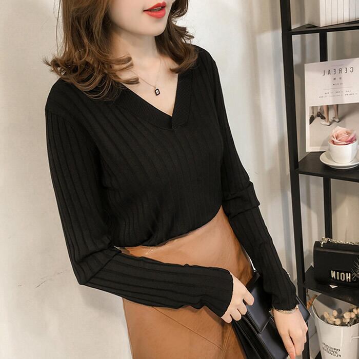 全2色 トップス ニット カットソー リブ レディース カジュアル 長袖 おしゃれ 大人 可愛い シンプル Vネック きれいめ フェミニン ベーシック オフィス 通勤 大きいサイズ カーキ ブラック 黒 春 冬 秋 20代 30代 40代 50代