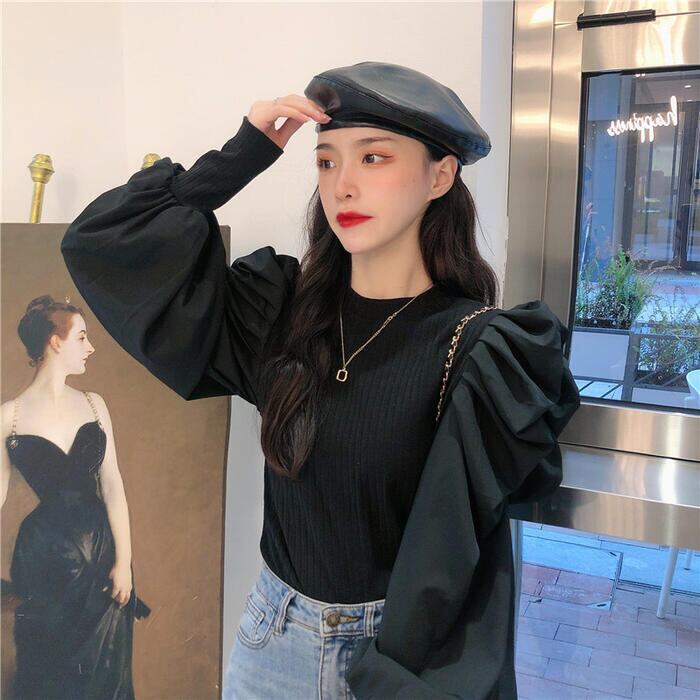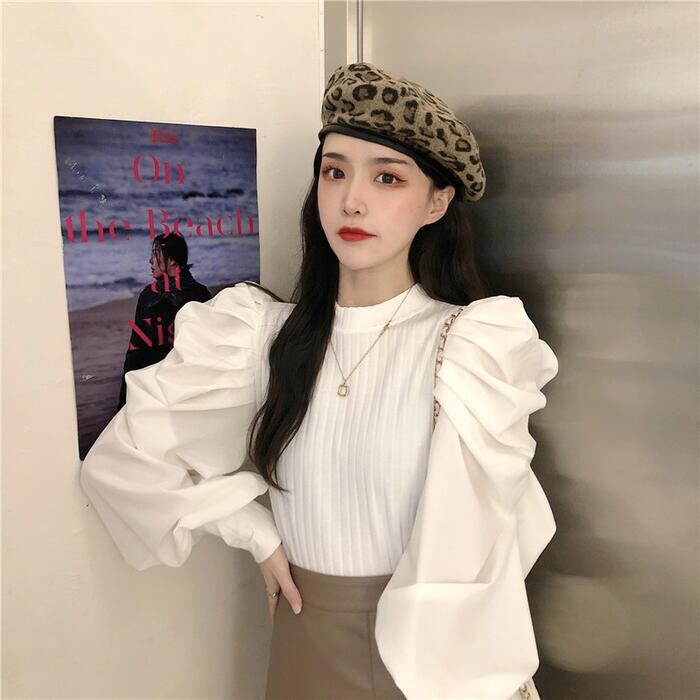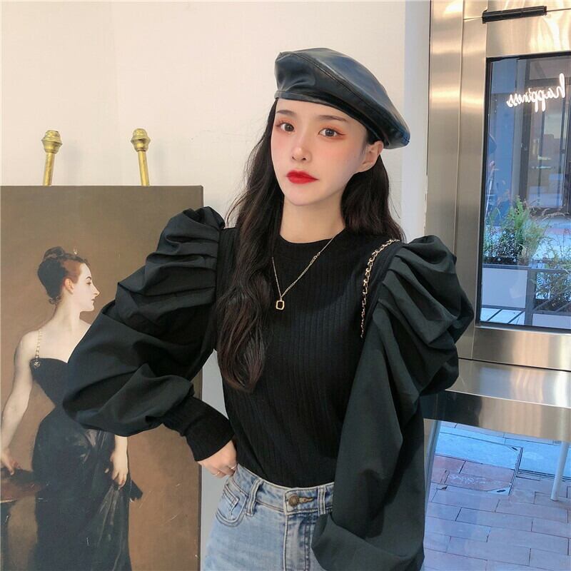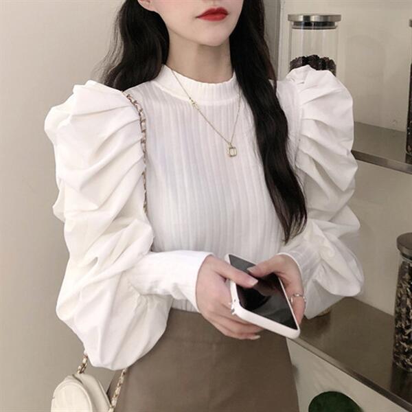 ボリュームあるパフスリーブがポイントのスタンドカラートップス。