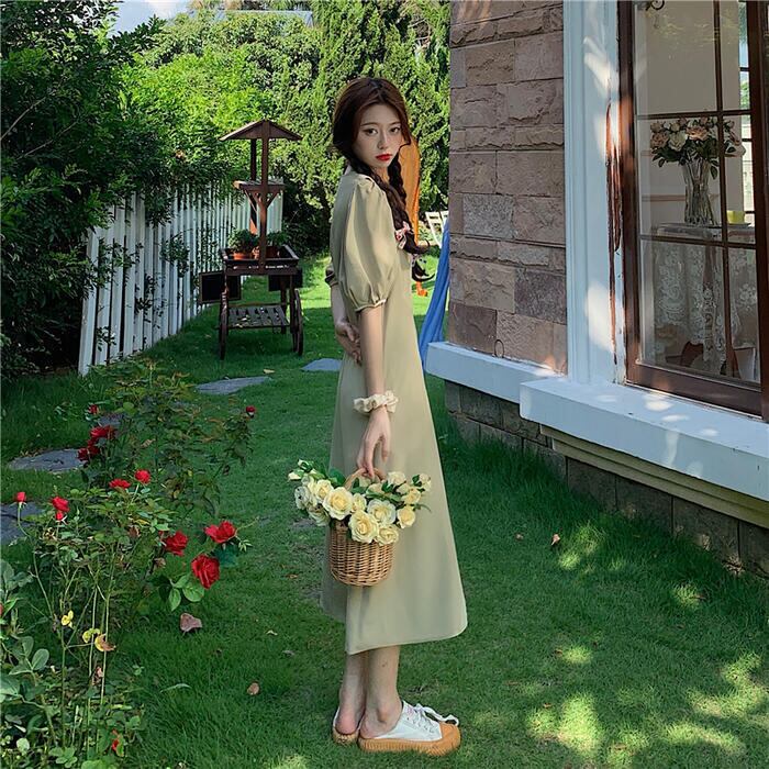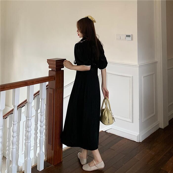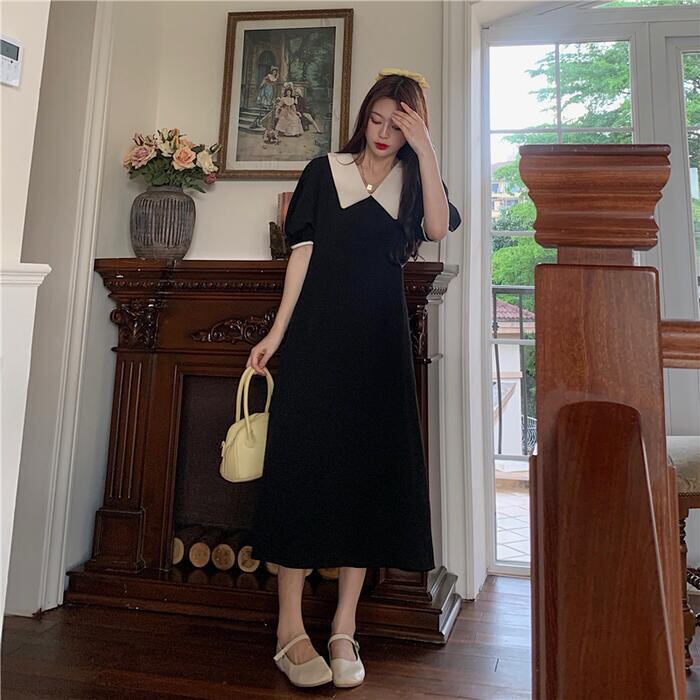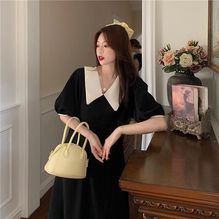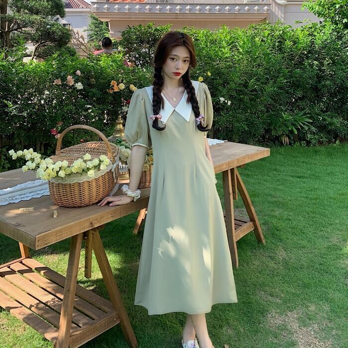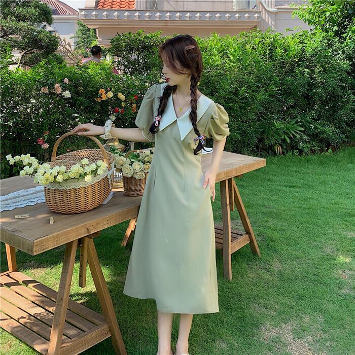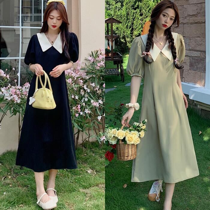 全2色 大きいサイズワンピース ビッグカラー ロングワンピ バイカラー おしゃれ 袖あり ミモレ丈 半袖 パフスリーブ カジュアル レディース ワンピ ドレス きれいめ シンプル Aライン 大人 可愛い グリーン 緑 ブラック 黒 春 夏 秋 20代 30代 40代 50代