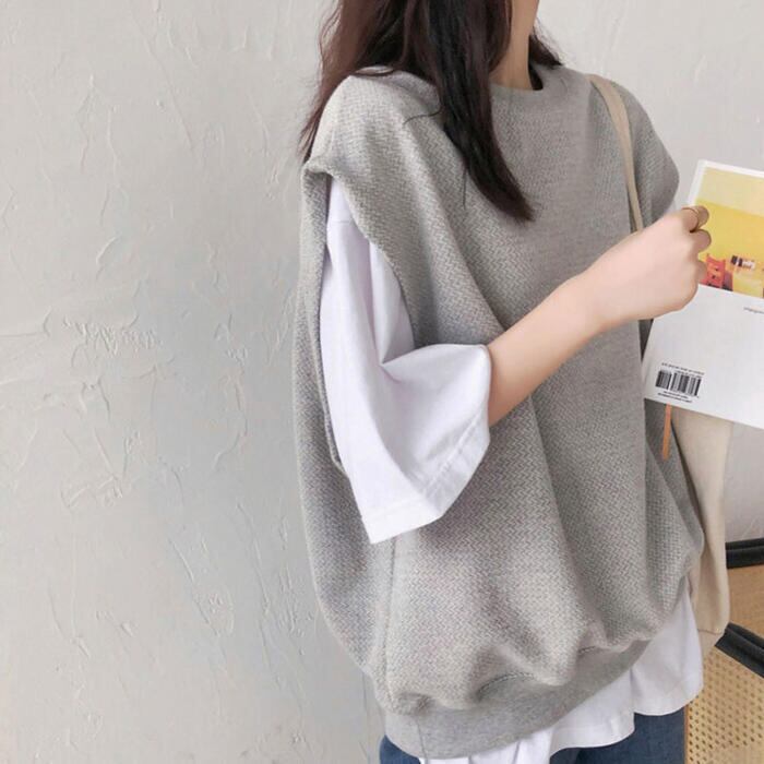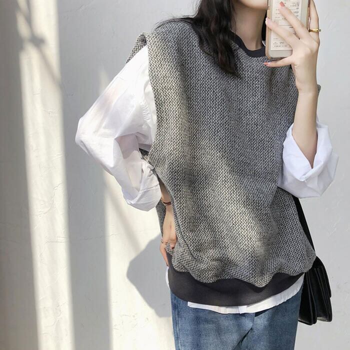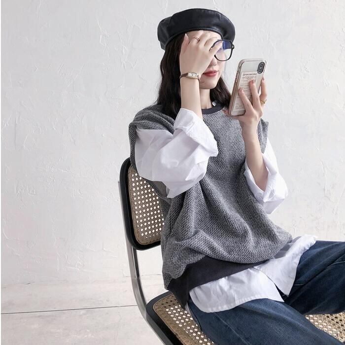 全2色 トップス ニット ベスト レイヤード レディース きれいめ カジュアル ノースリーブ おしゃれ 大人 可愛い フェミニン ゆったり 体系カバー 重ね着 こなれ感 オーバーサイズ グレー 春 夏 秋 20代 30代 40代 50代