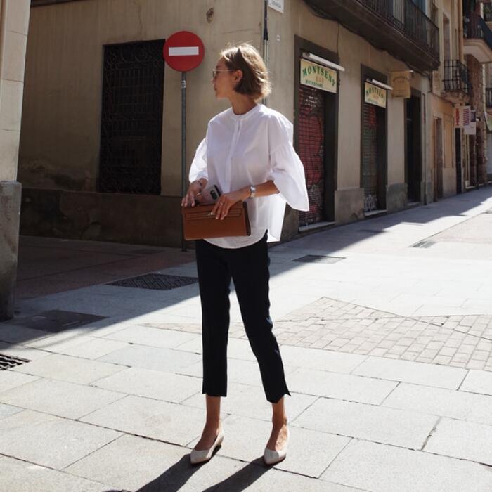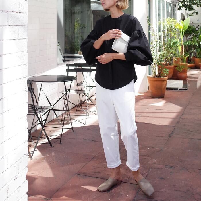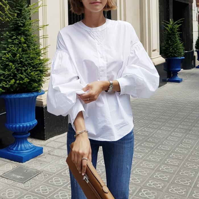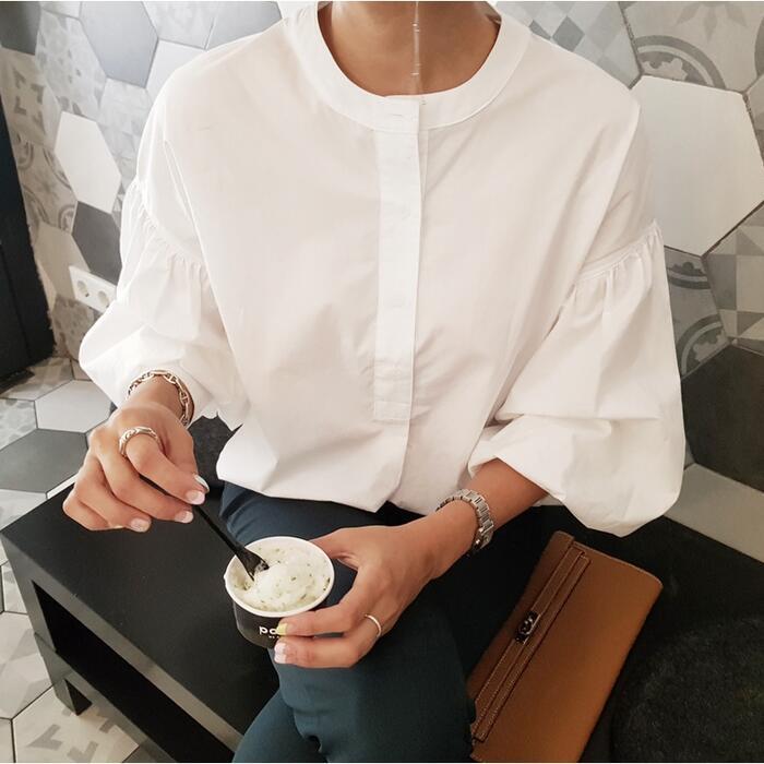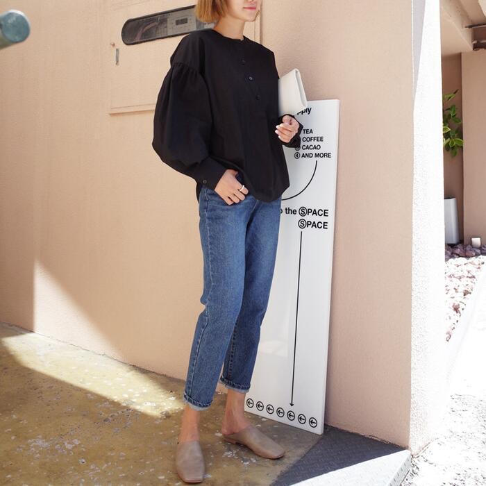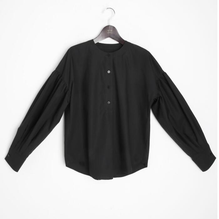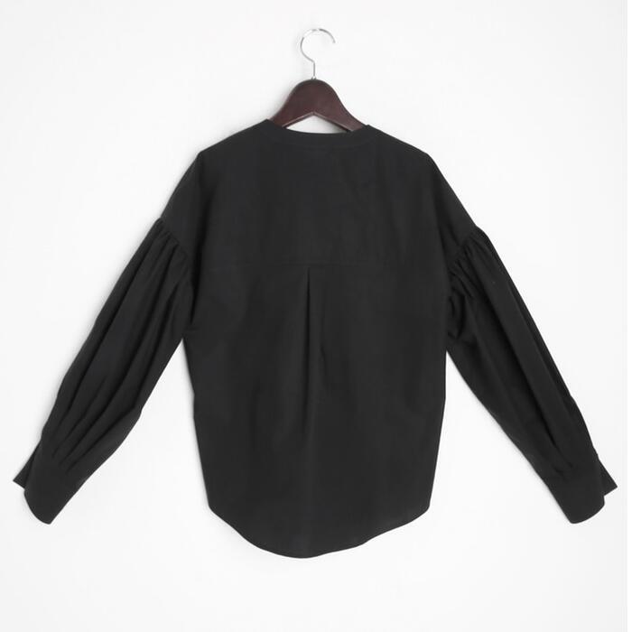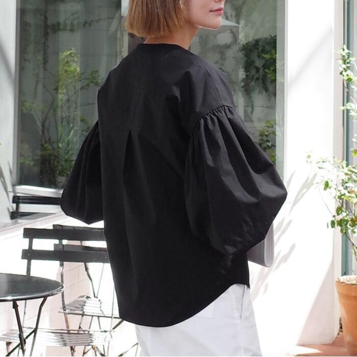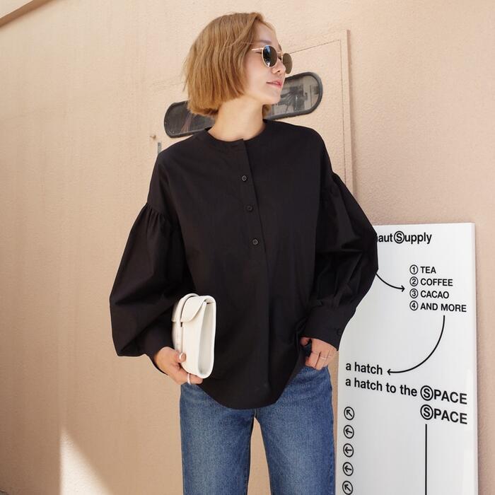 ふんわりしたボリュームスリーブが可愛いノーカラーブラウス。