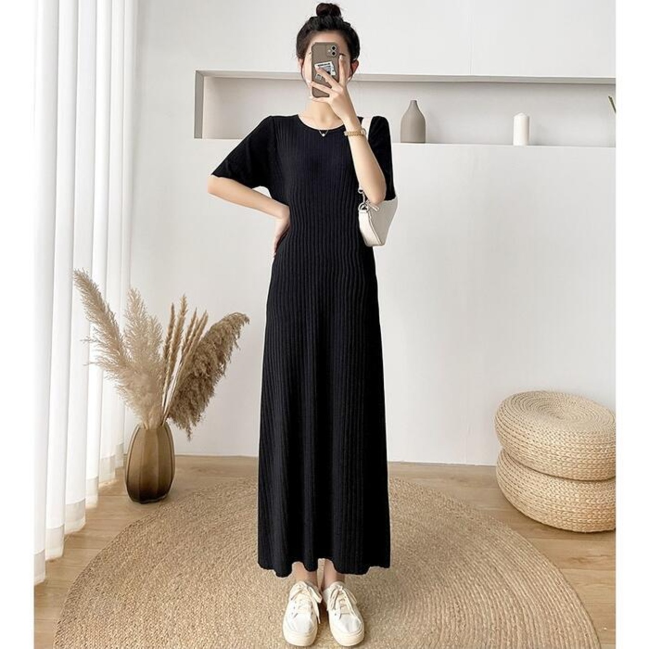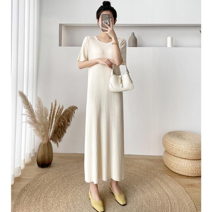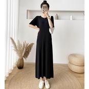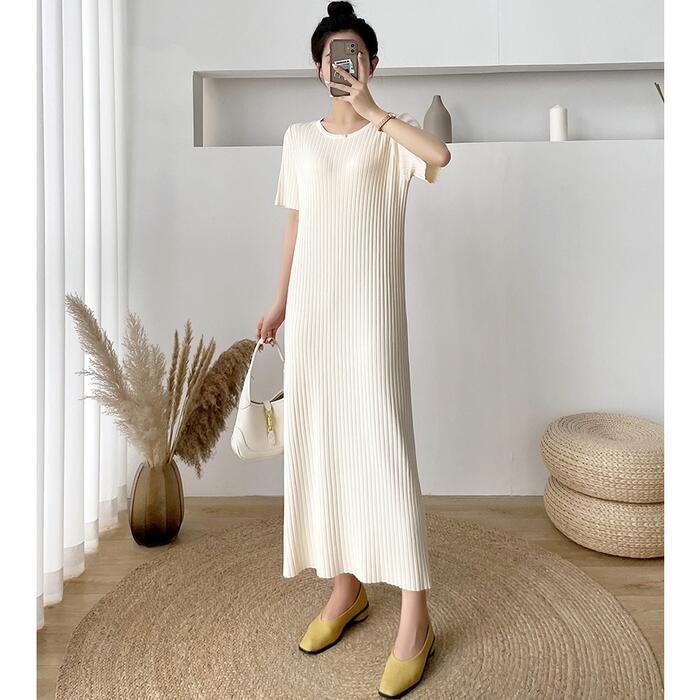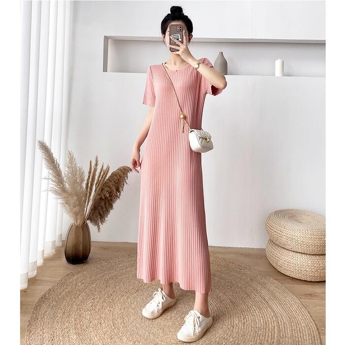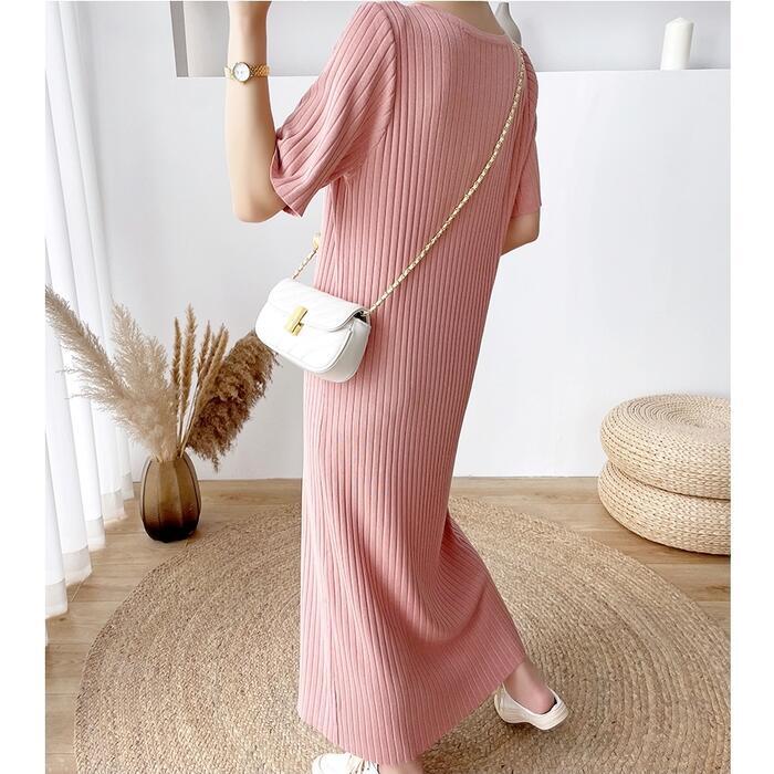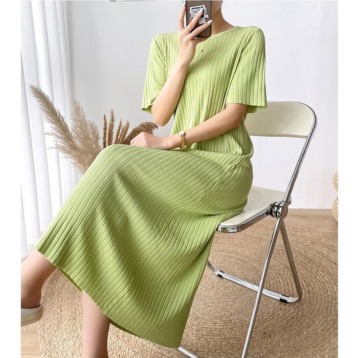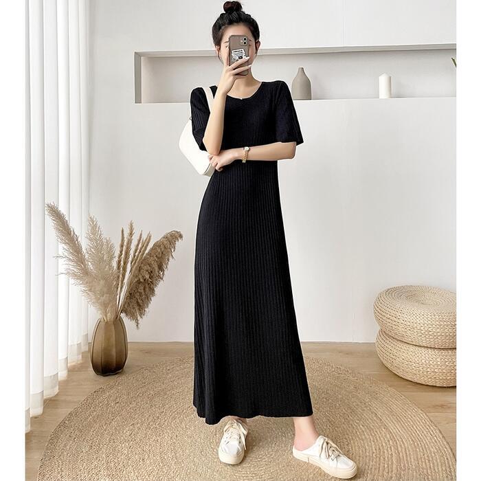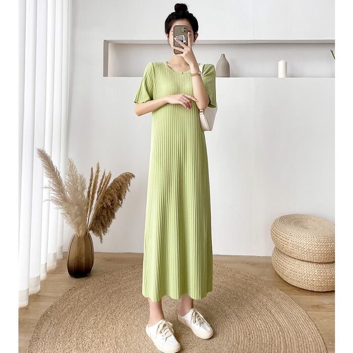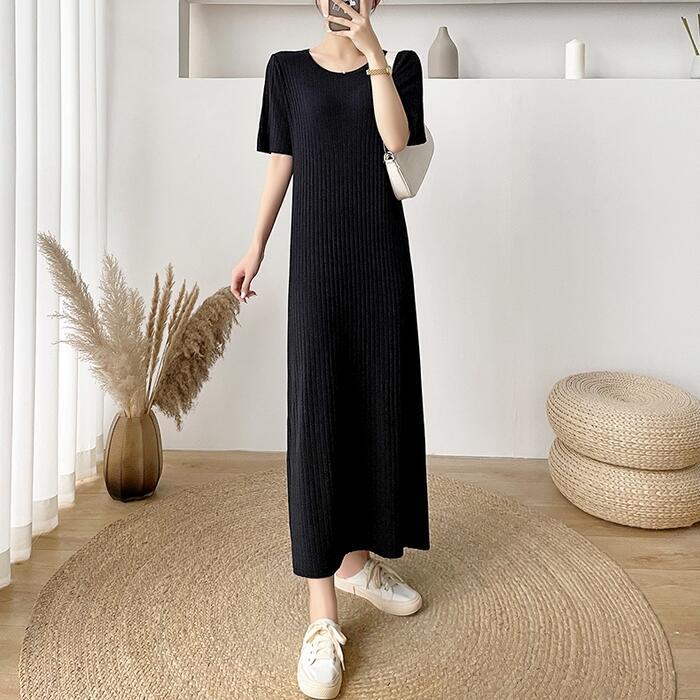 全4色 大きいサイズワンピース ロングワンピ ニット おしゃれ 袖あり ロング丈 半袖 カジュアル レディース ワンピ ドレス きれいめ シンプル 体型カバー 大人 可愛い 楽ちん グリーン 緑 ピンク ベージュ ブラック 黒 春 夏 秋 20代 30代 40代 50代