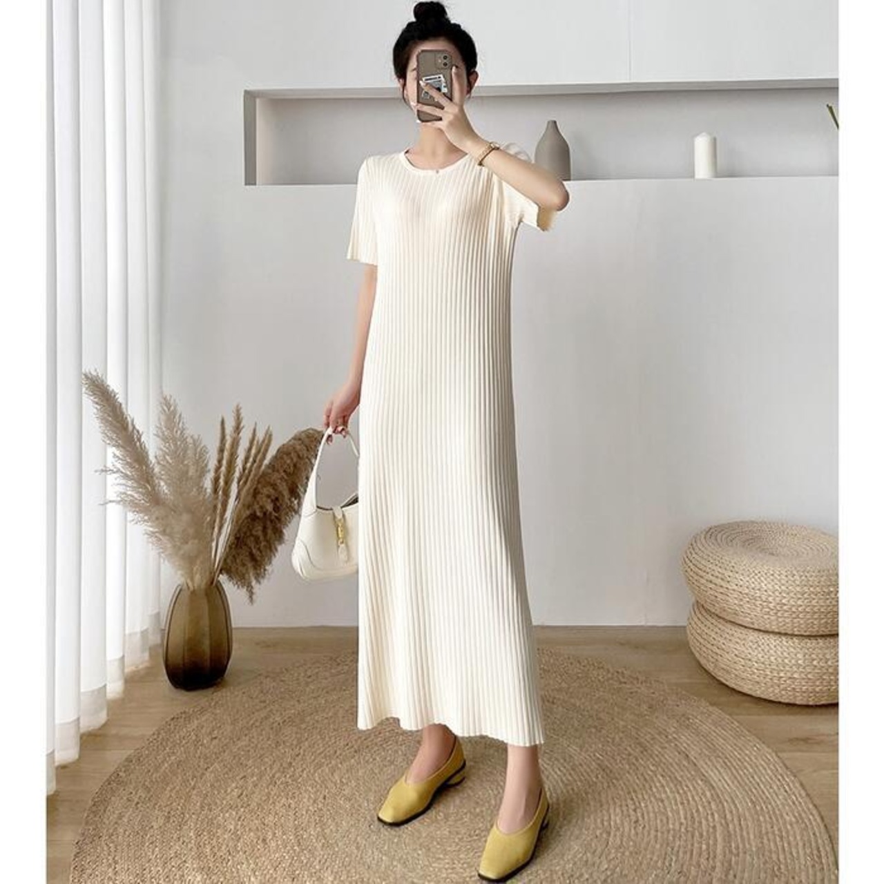 ストンとしたIラインのニットワンピース。