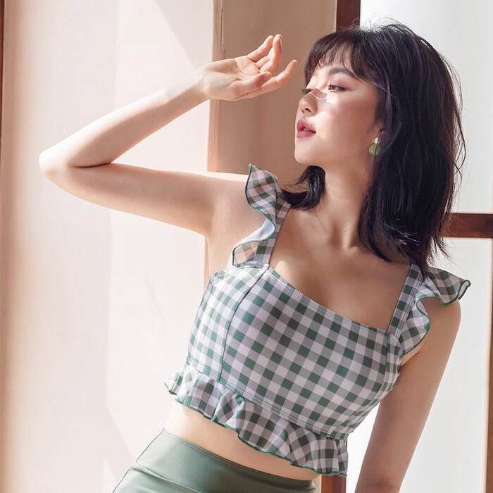 レディース 水着 セパレート ギンガムチェック フリル タンキニ タンクトップ おしゃれ スイムウェア 体形カバー リゾート 海 プール 夏 フェミニン きれいめ 大人 可愛い キュート 大きいサイズ グリーン 緑 20代 30代 40代 50代