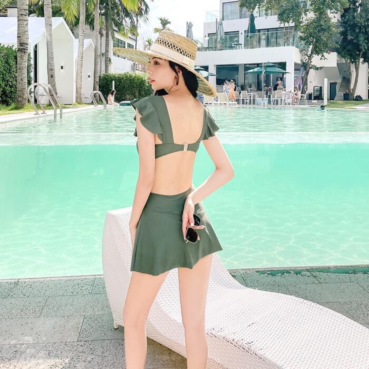 後ろ姿はビキニに見えるモノキニタイプの水着。