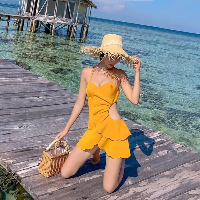 レディース 水着 ワンピース フリル ホルターネック おしゃれ スイムウェア 体形カバー リゾート 海 プール 夏 フェミニン きれいめ 大人 可愛い スリム 大きいサイズ イエロー 20代 30代 40代 50代