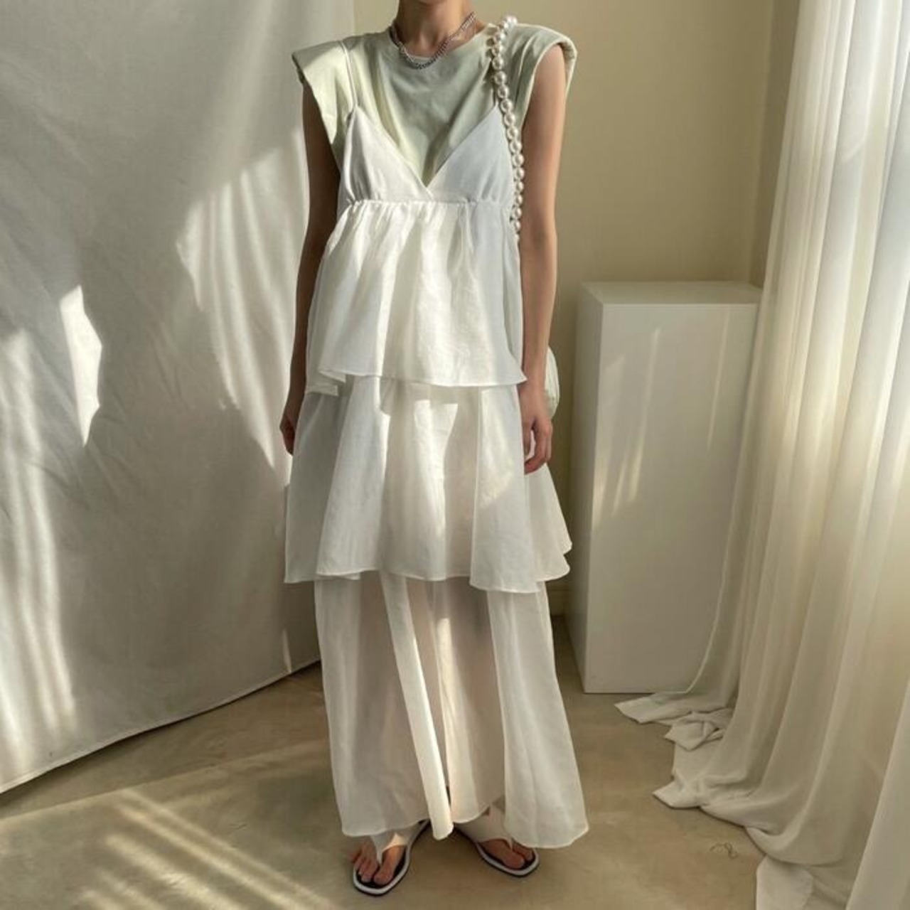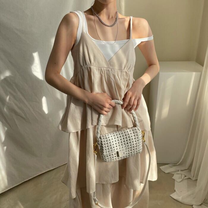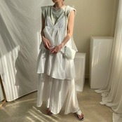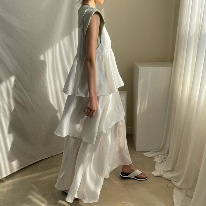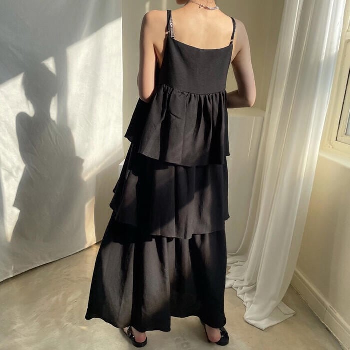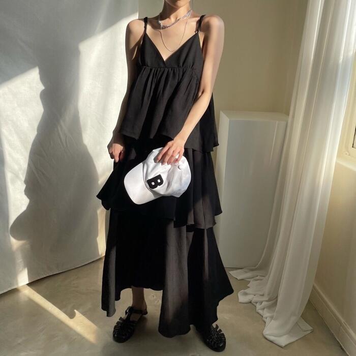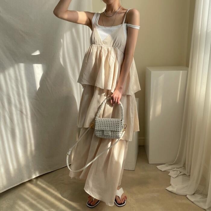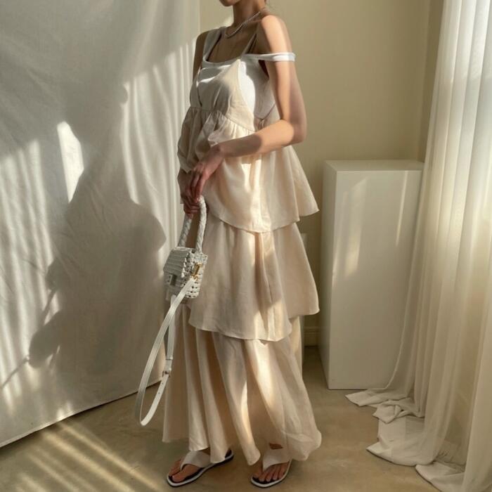 キャミソールタイプのフリルティアードワンピース。