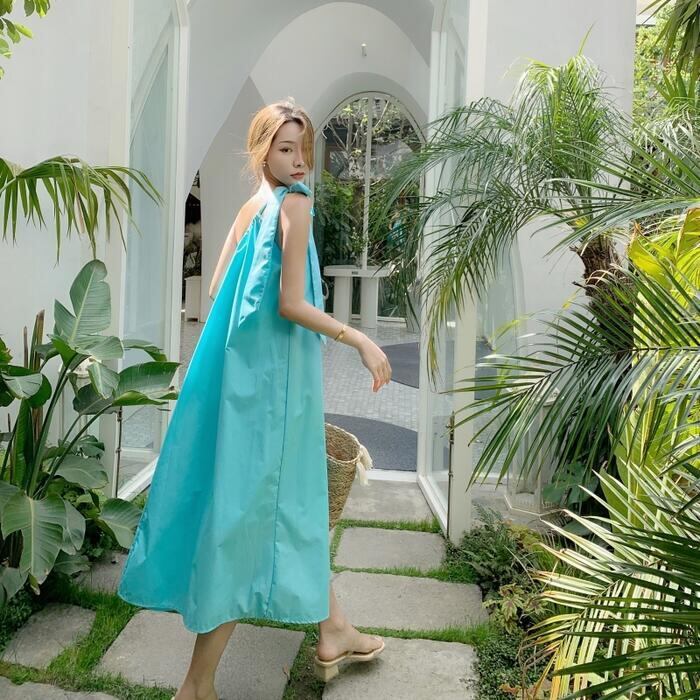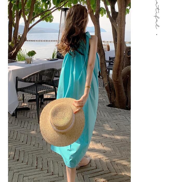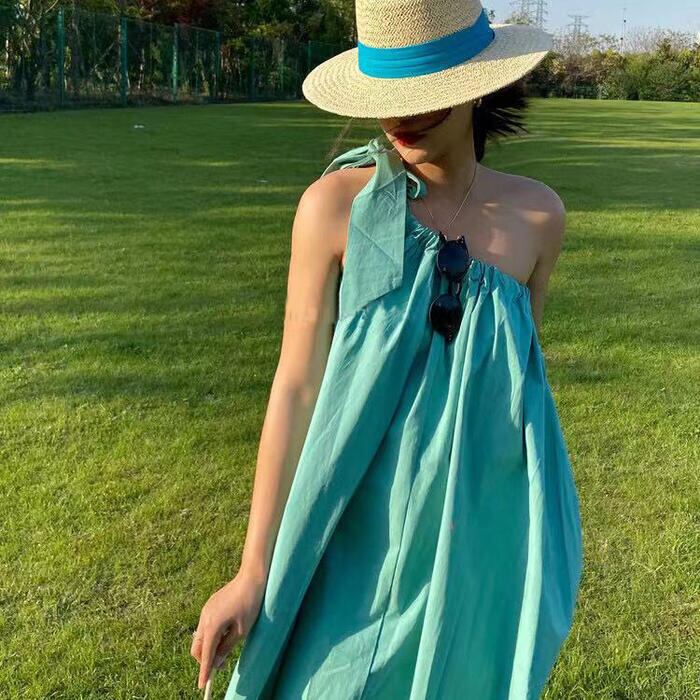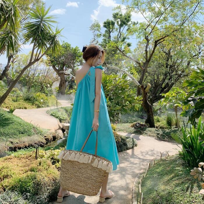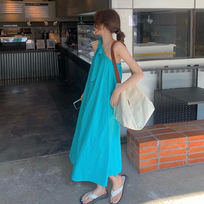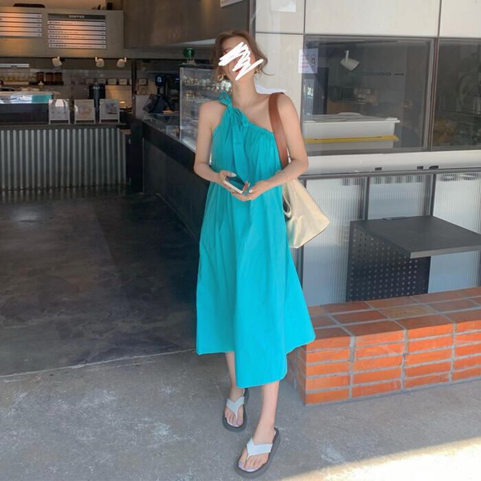 大きいサイズワンピース ロングワンピ おしゃれ キャミソールワンピース ワンショルダー ロング丈 カジュアル レディース ワンピ ドレス きれいめ ゆったり 大人 可愛い 体型カバー ビーチ リゾート シンプル ブルー 青 春 夏 秋 20代 30代 40代 50代