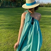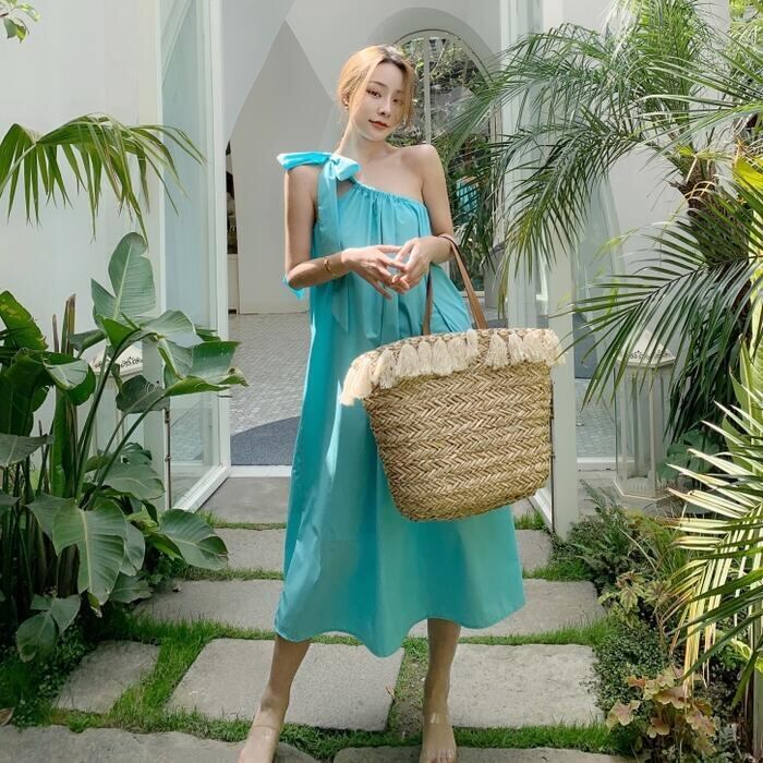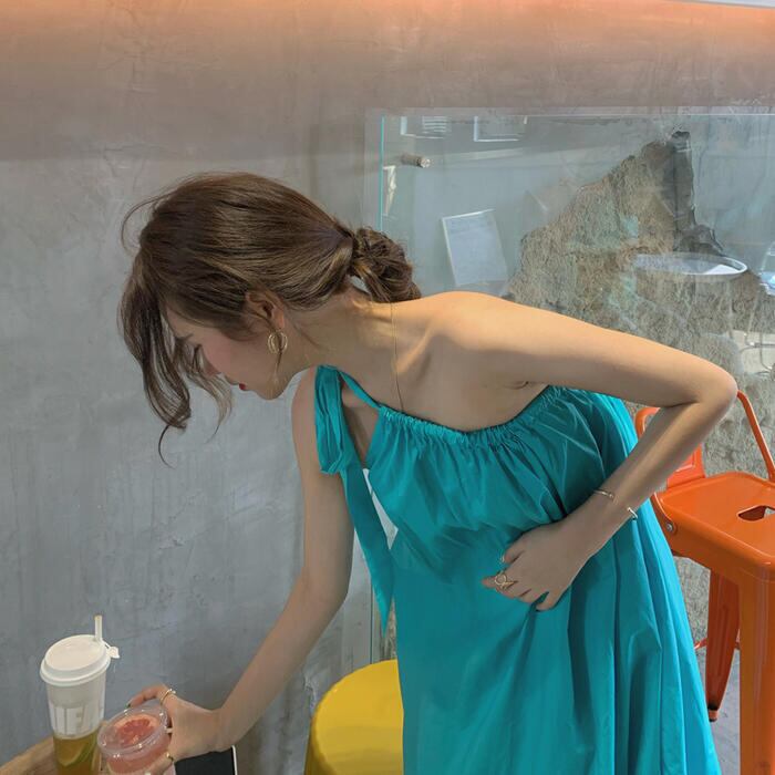 きれいなブルーカラーのワンショルダーワンピース。