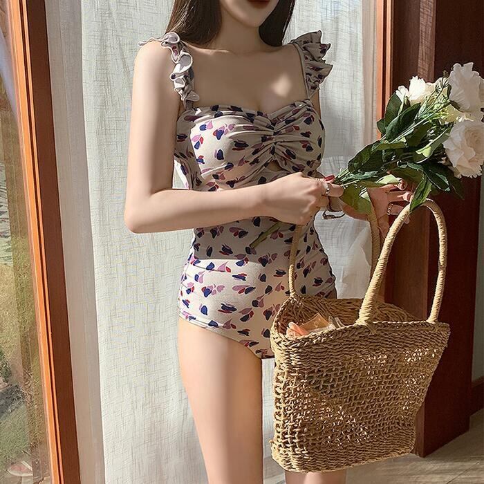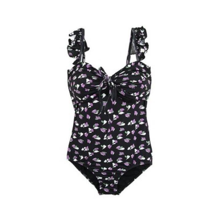 全2色 レディース 水着 ワンピース プリント フリル おしゃれ スイムウェア 体形カバー リゾート 海 プール 夏 フェミニン きれいめ 大人 可愛い クラシカル レトロ 大きいサイズ ベージュ ブラック 黒 20代 30代 40代 50代