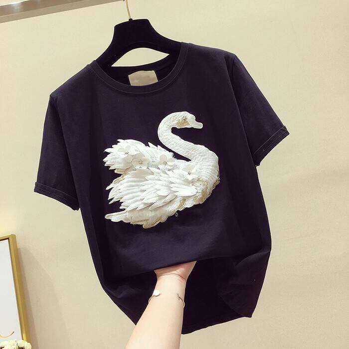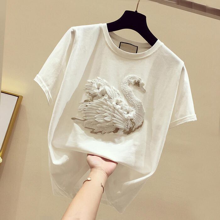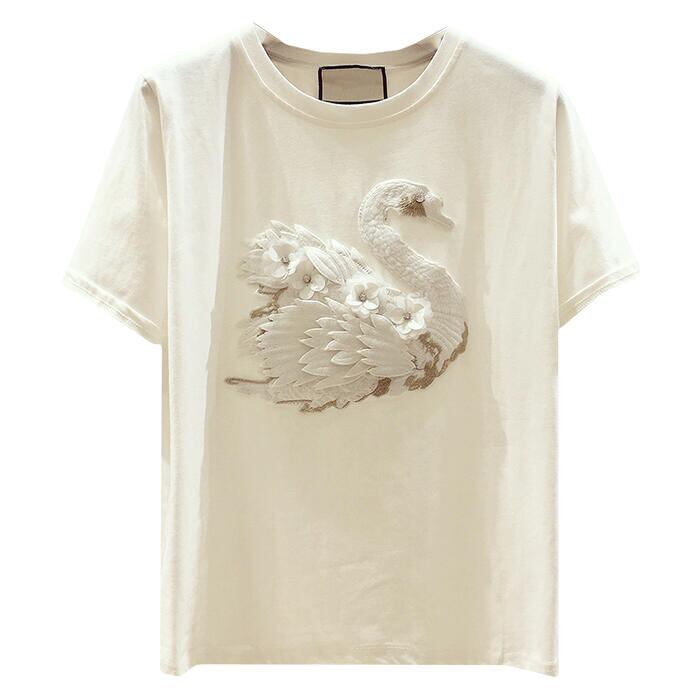 全2色 トップス Tシャツ カットソー 刺繍 レディース カジュアル 半袖 おしゃれ 大人 可愛い エレガント フェミニン クルーネック きれいめ スワン 白鳥 大きいサイズ ブラック 黒 ホワイト 白 春 夏 秋 20代 30代 40代 50代
