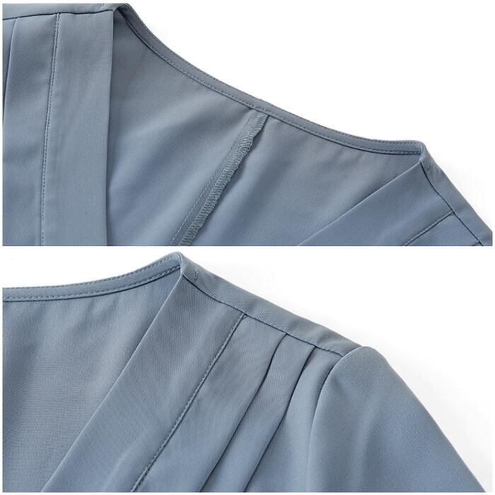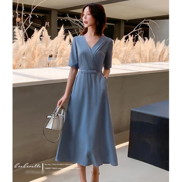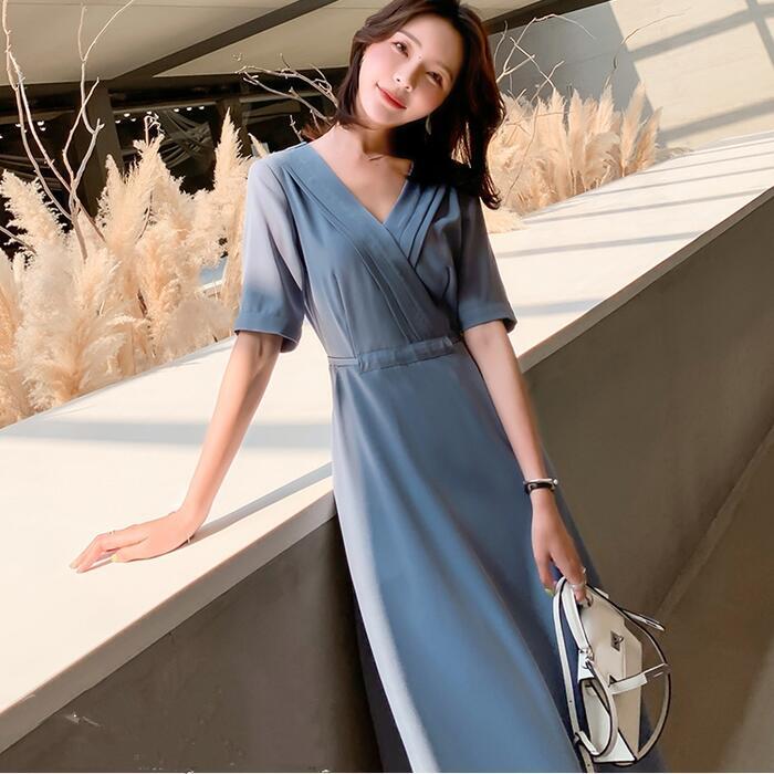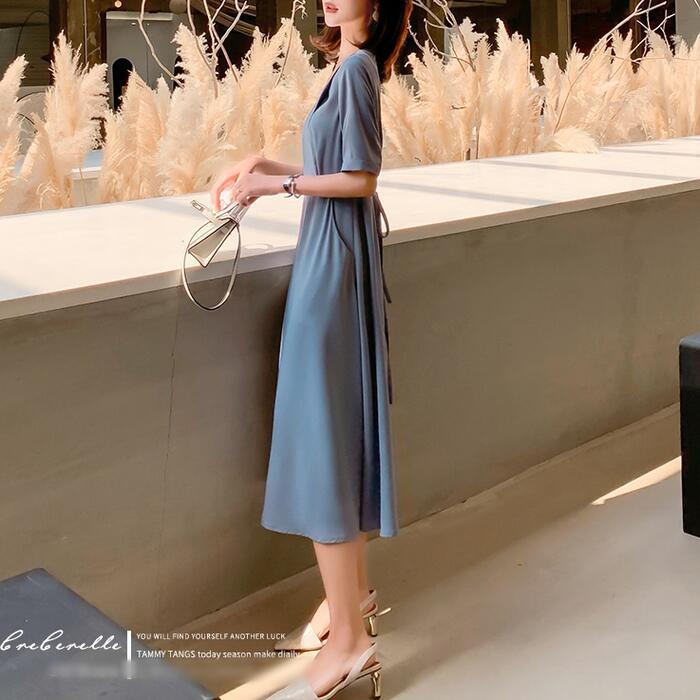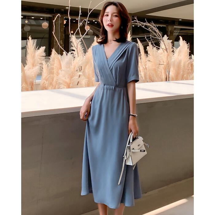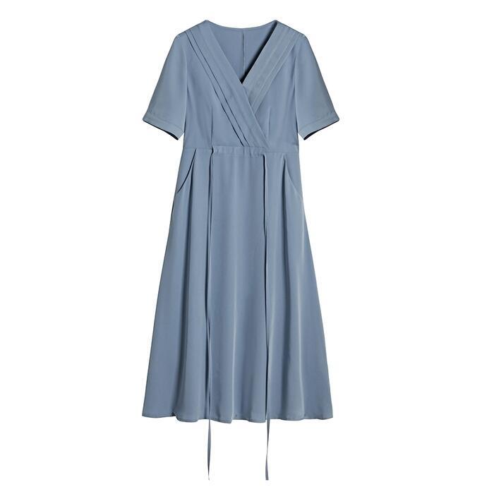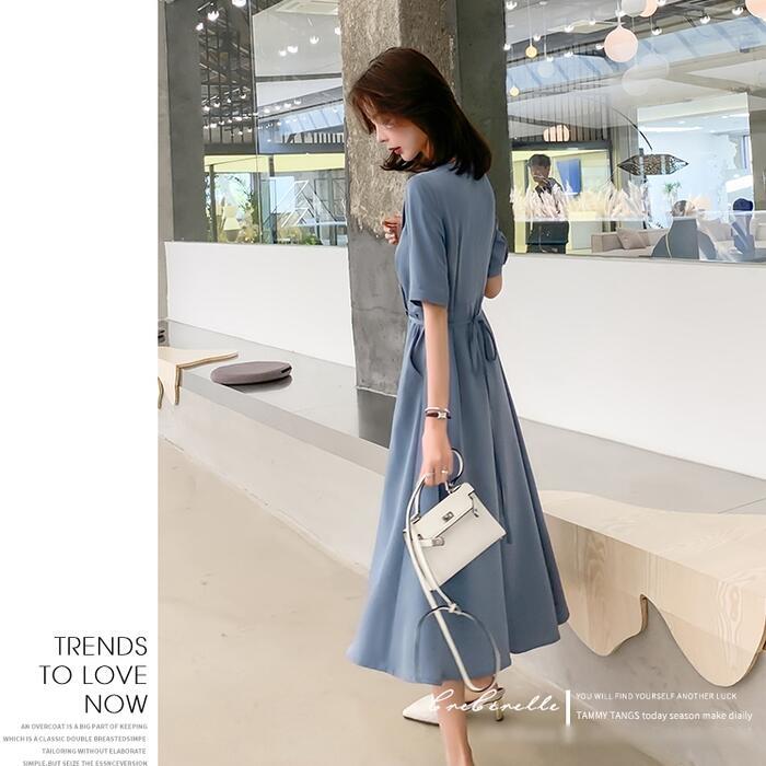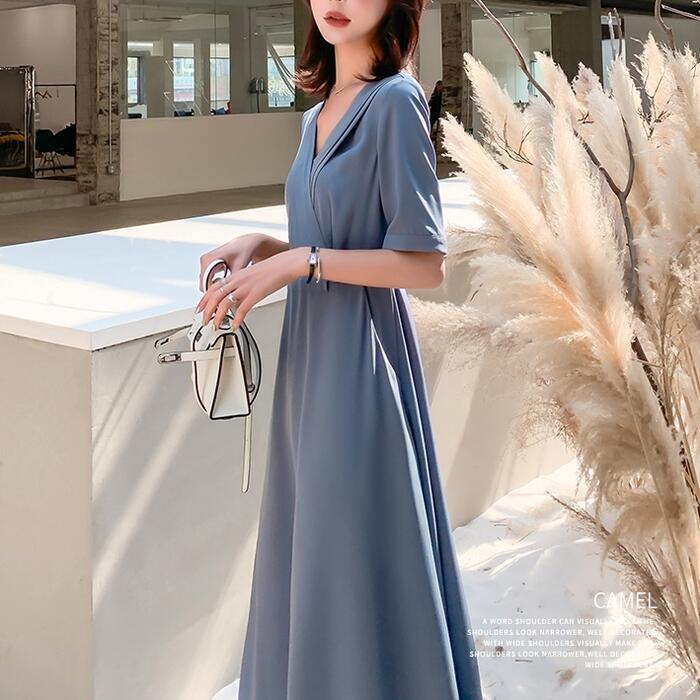 ワンピース ロングワンピ 袖あり おしゃれ ミモレ丈 きれいめ カジュアル 半袖 レディース ワンピ ドレス ウエストリボン ハイウエスト シンプル Vネック 大人 可愛い 通勤 大きいサイズ ブルー 青 春 夏 秋 20代 30代 40代 50代