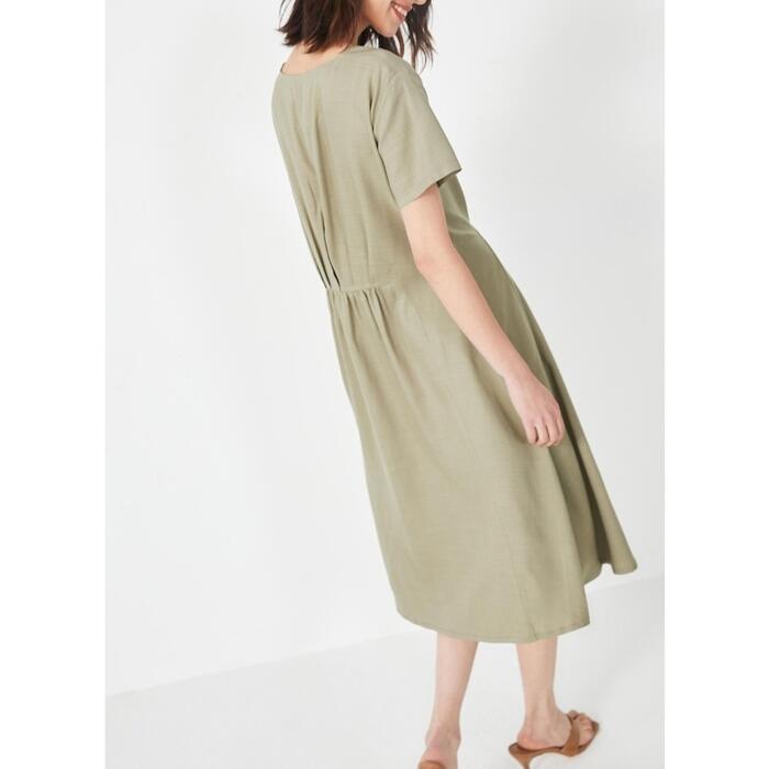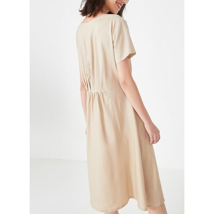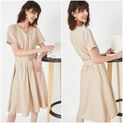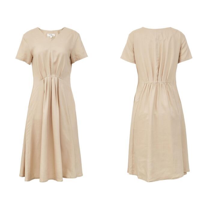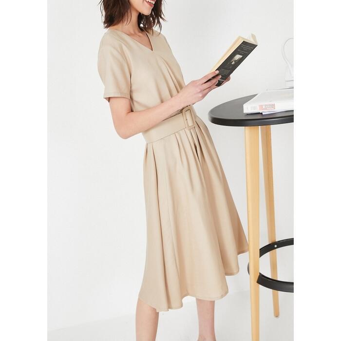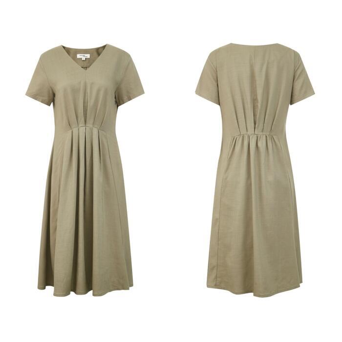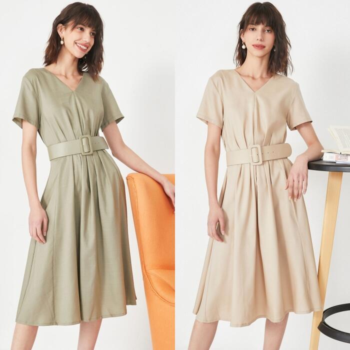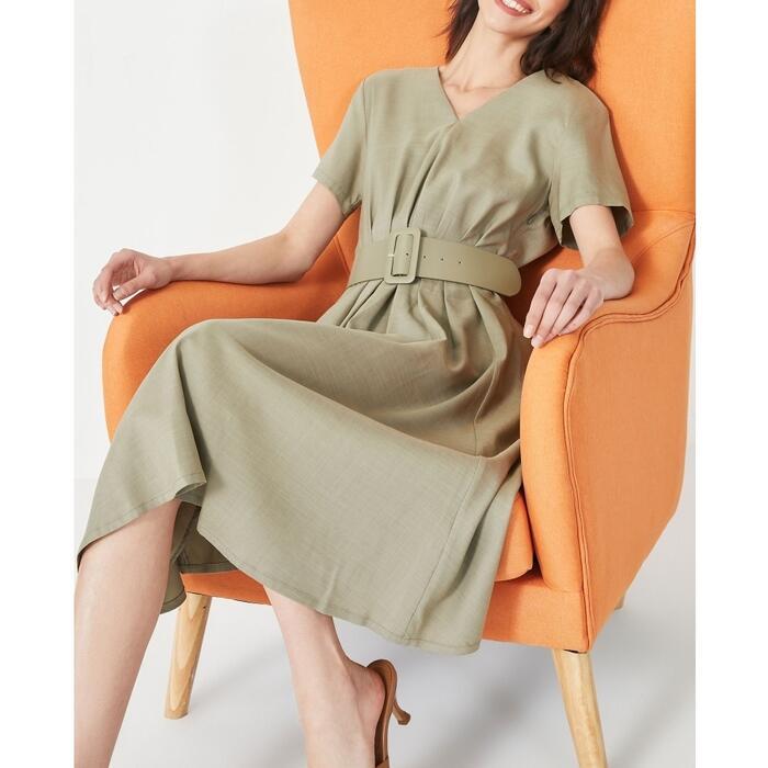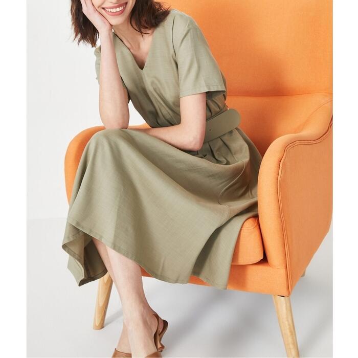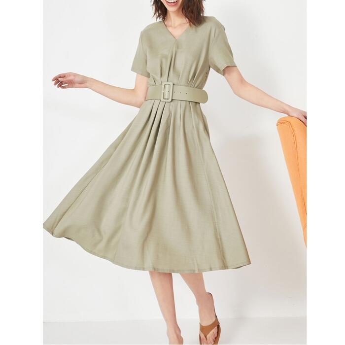 全2色 ワンピース ミディワンピ 袖あり おしゃれ ひざ丈 きれいめ カジュアル 半袖 レディース ワンピ ドレス ハイウエスト ウエストベルト フェミニン Vネック 大人 可愛い Aライン ベージュ グリーン 緑 春 夏 秋 20代 30代 40代 50代