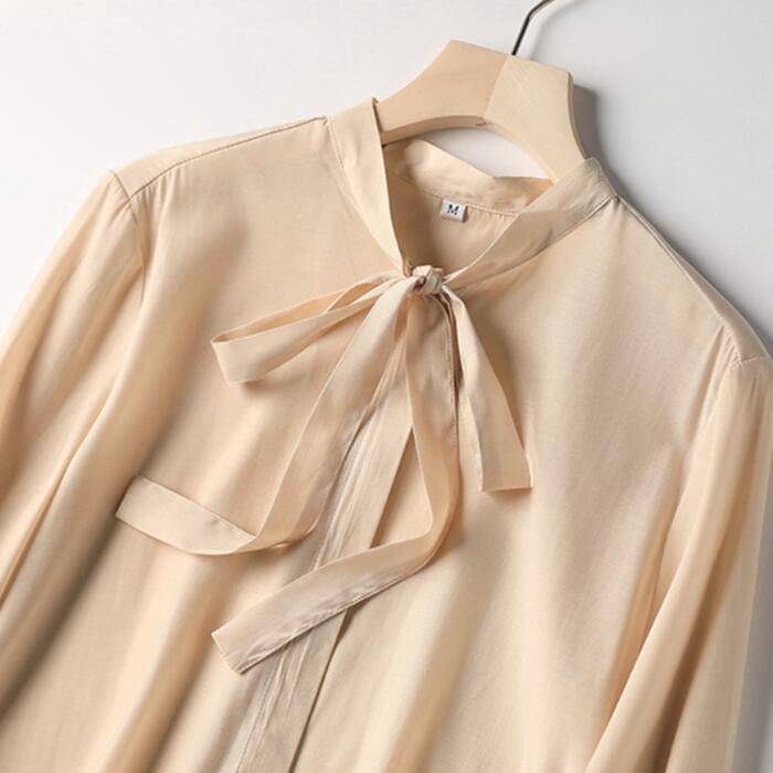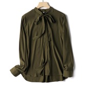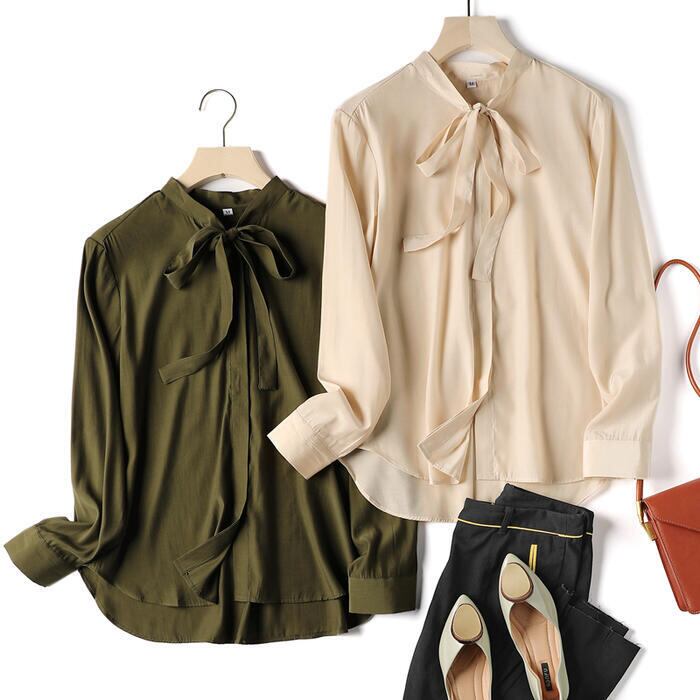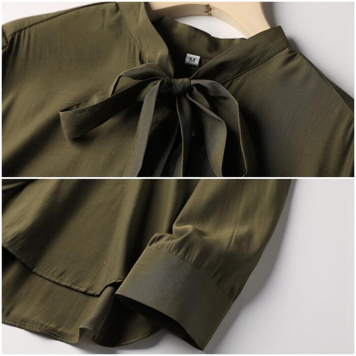 全2色 トップス ボウタイ リボンタイ ブラウス シャツ レディース カジュアル 長袖 おしゃれ きれいめ 大人 可愛い エレガント フェミニン お呼ばれ オフィス 通勤 シンプル グリーン 緑 ベージュ 春 冬 秋 20代 30代 40代 50代