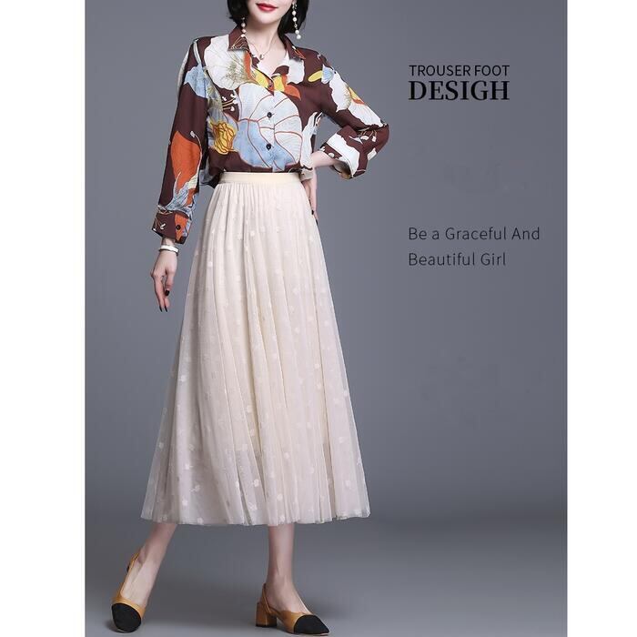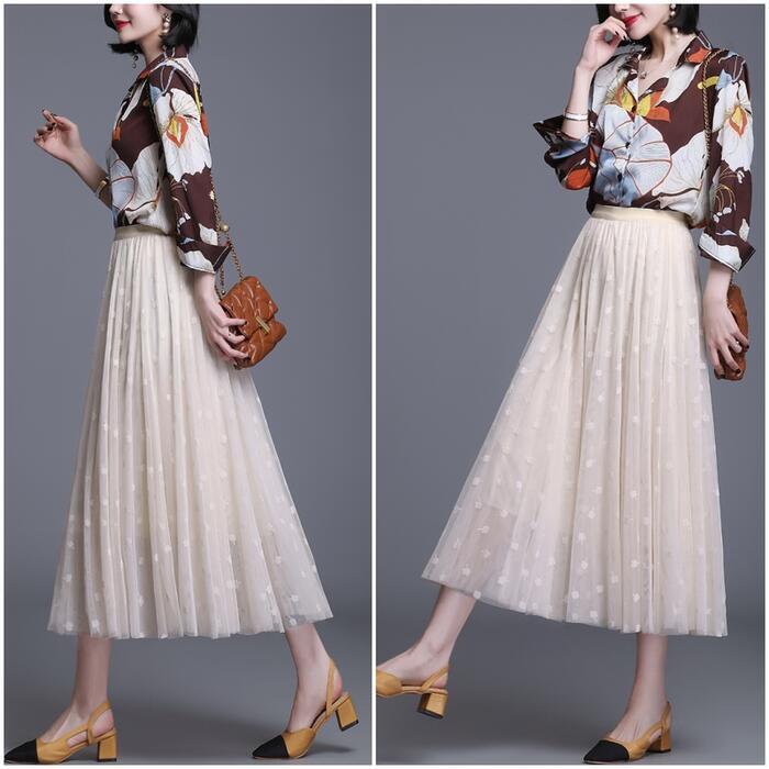ミモレ丈でエアリーな質感が足元を可憐に演出します。