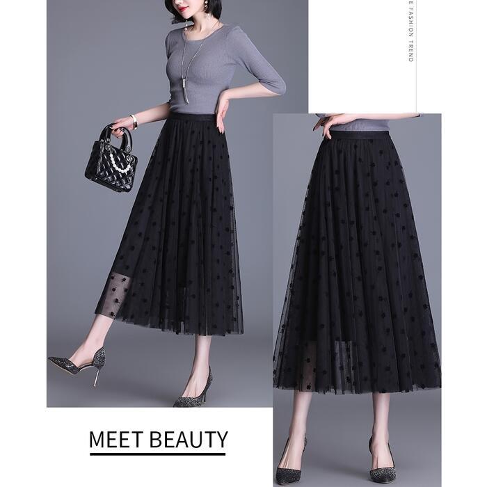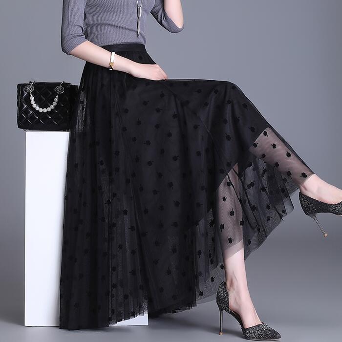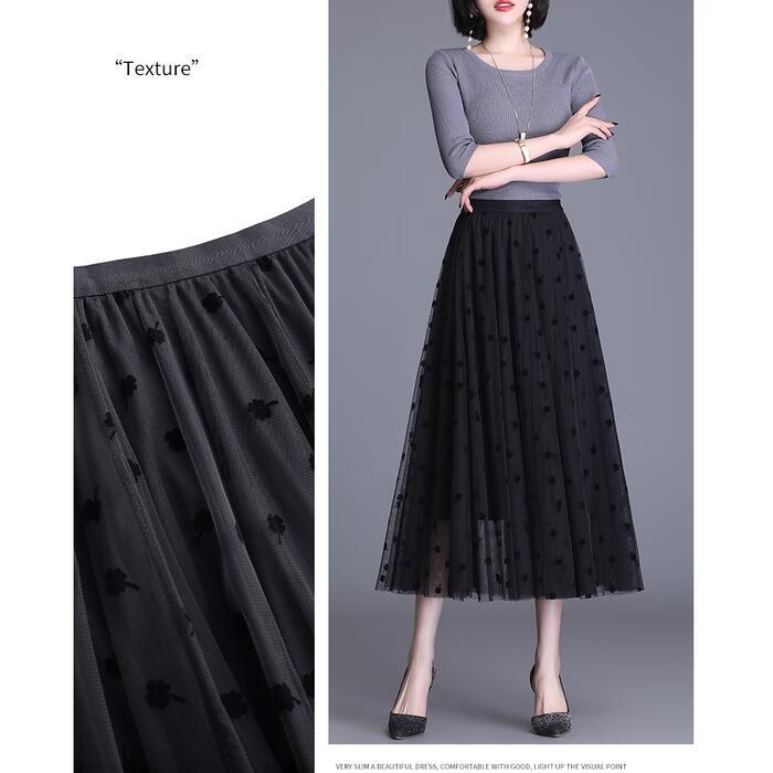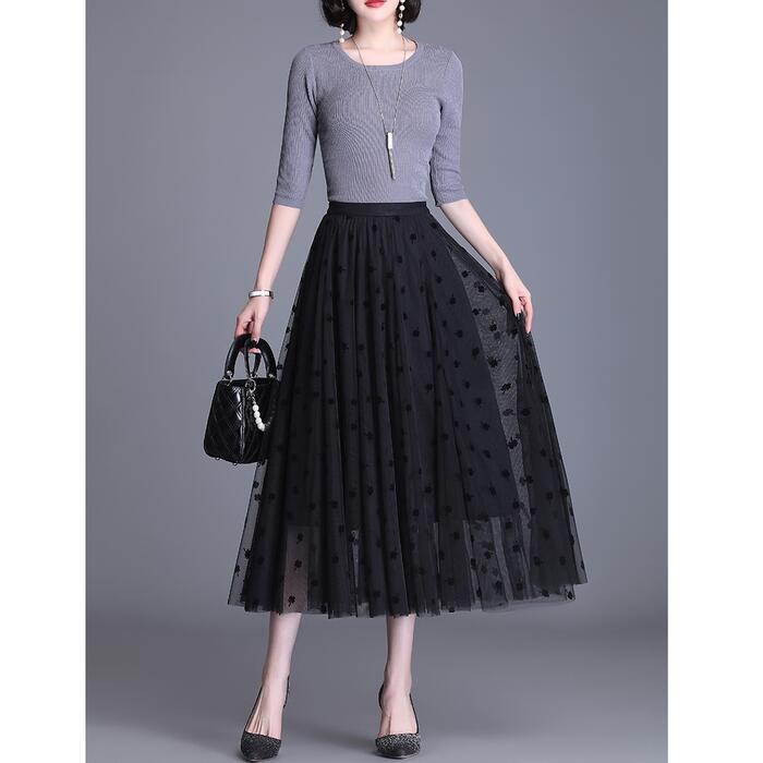 全2色 スカート ロングスカート ミモレ丈 チュール クローバー カジュアル レディース フェミニン 大人 可愛い きれいめ シンプル ゆったり ウエストゴム 体型カバー 透け感 ベージュ ブラック 黒 春 秋 夏 20代 30代 40代 50代