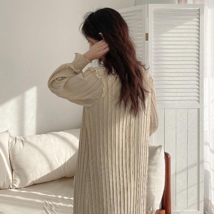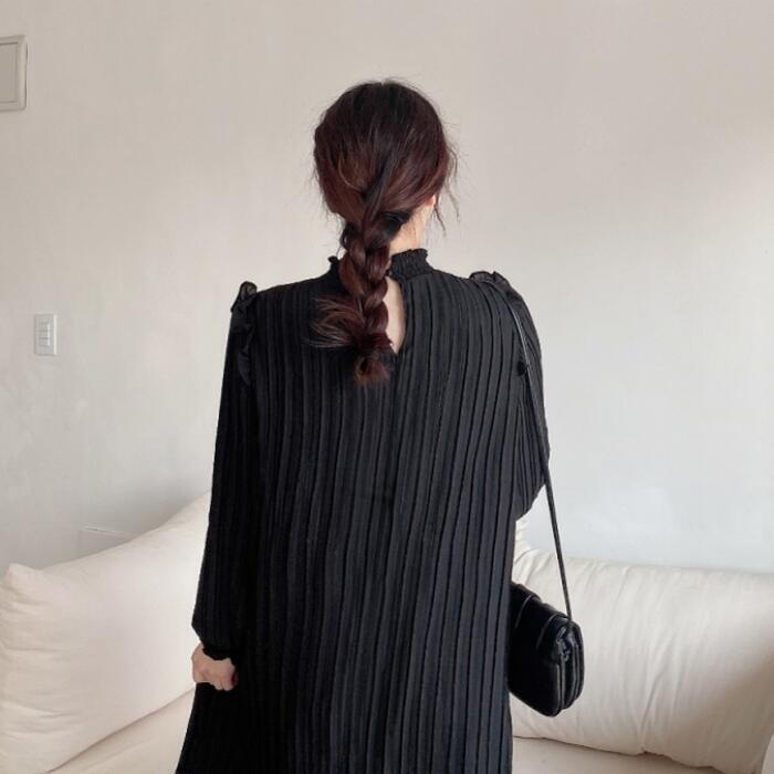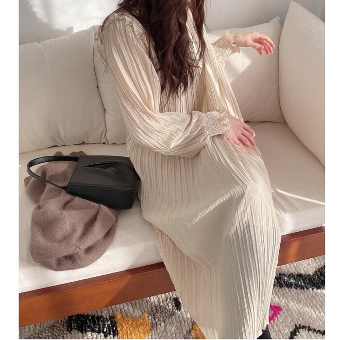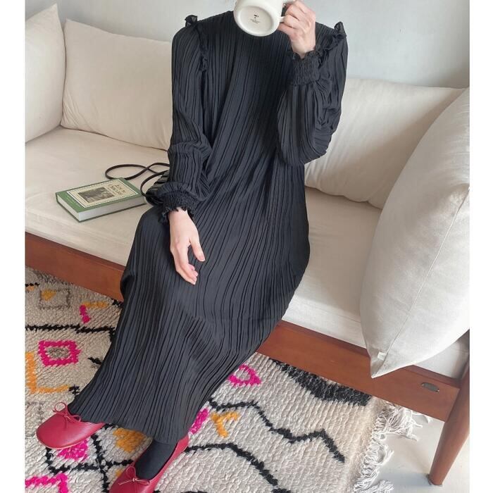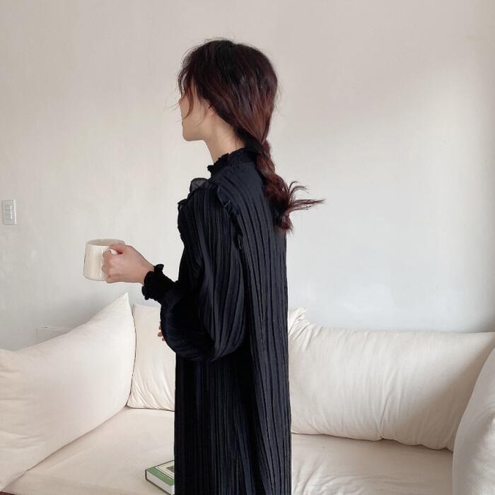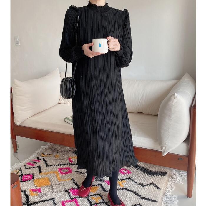 全2色 ワンピース ロングワンピ プリーツ レディース 袖あり フリル 長袖 きれいめ カジュアル ミモレ丈 おしゃれ ゆったり 体型カバー ナチュラル 大人 可愛い ワンピ ドレス ベージュ ブラック 春 秋 夏 20代 30代 40代 50代