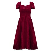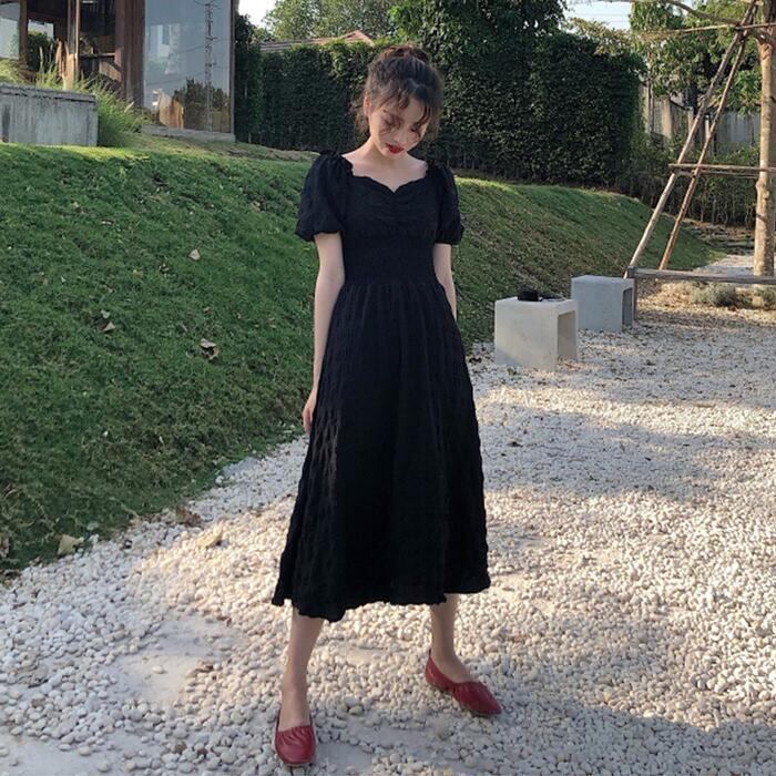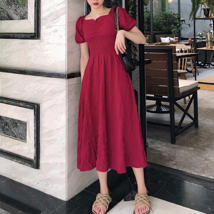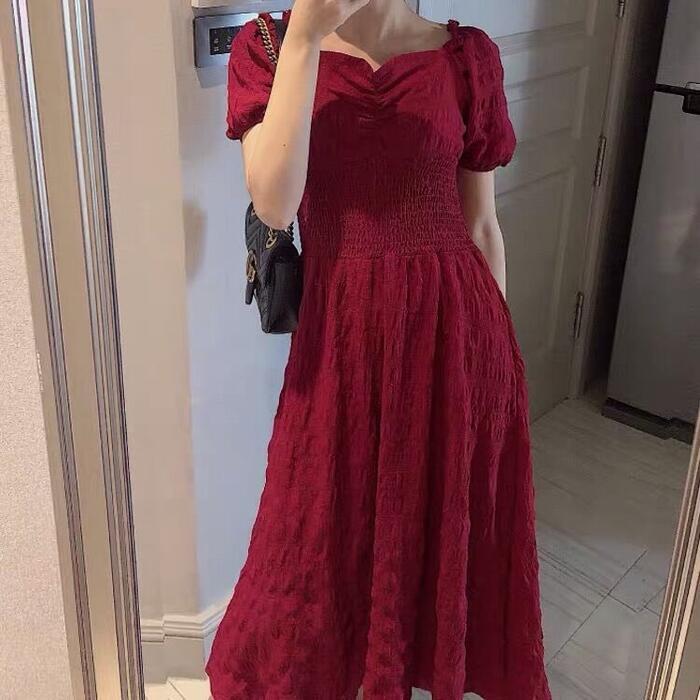 全2色 大きいサイズワンピース ロングワンピ パフスリーブ レディース 袖あり 半袖 きれいめ エレガント カジュアル ミモレ丈 おしゃれ クラシカル スクエアネック 大人 可愛い ワンピ ドレス レッド 赤 ブラック 春 秋 夏 20代 30代 40代 50代