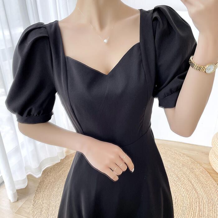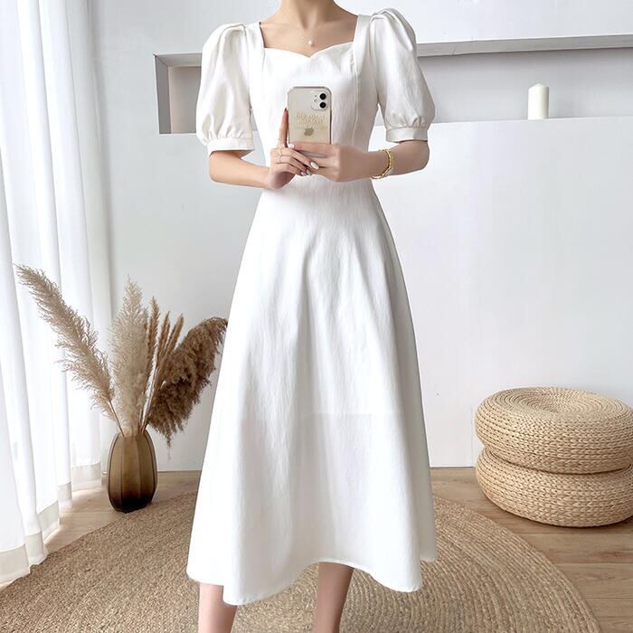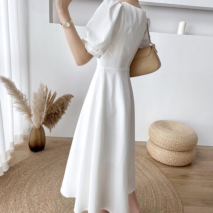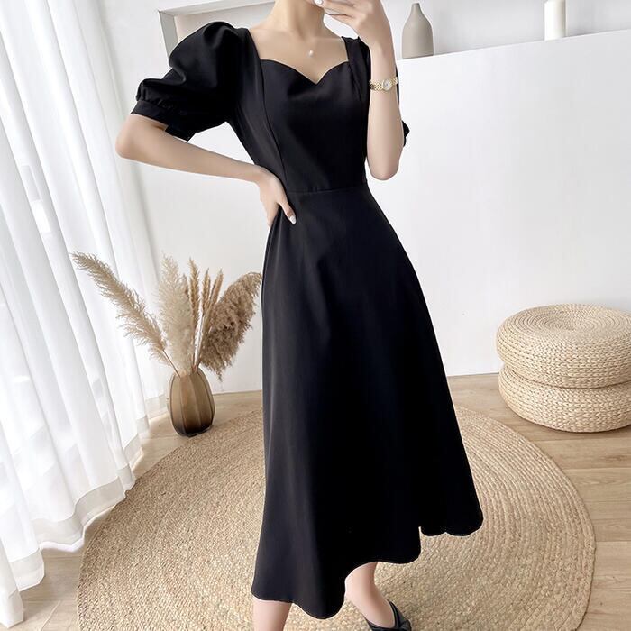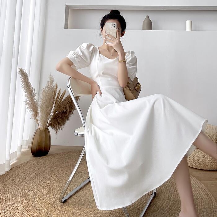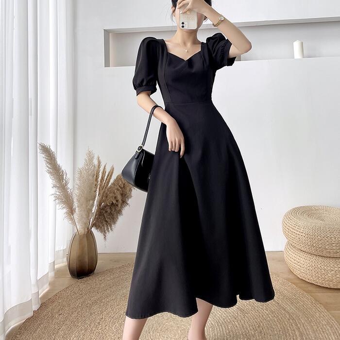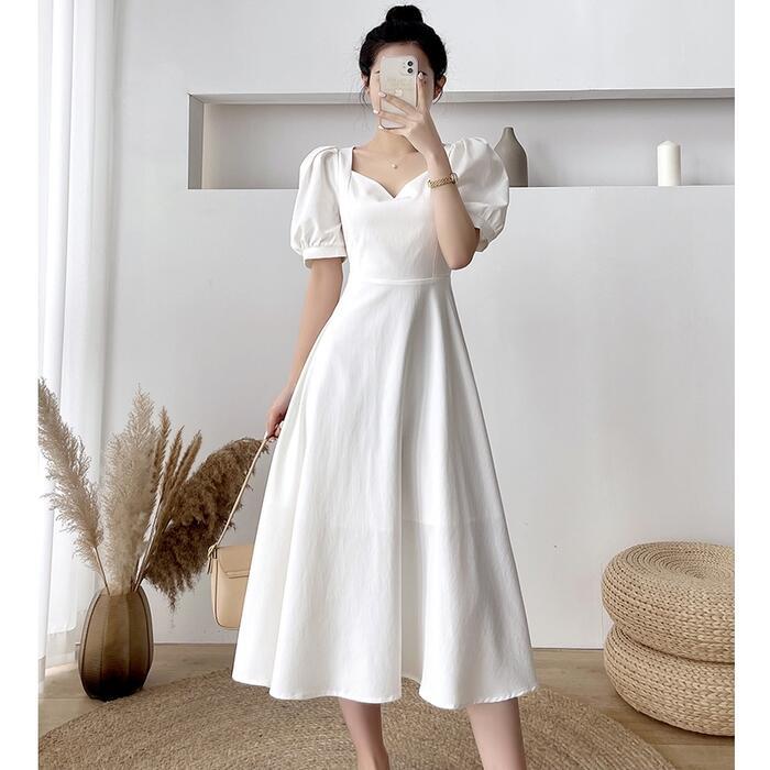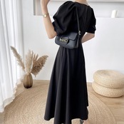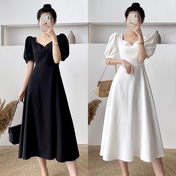 全2色 大きいサイズ結婚式 ワンピース ロングワンピ 袖あり パフスリーブ ミモレ丈 エレガント きれいめ レディース ドレス 半袖 フォーマル セレモニー 発表会 パーティー 大人 可愛い クラシカル ホワイト 白 ブラック 黒 春 秋 夏 20代 30代 40代 50代