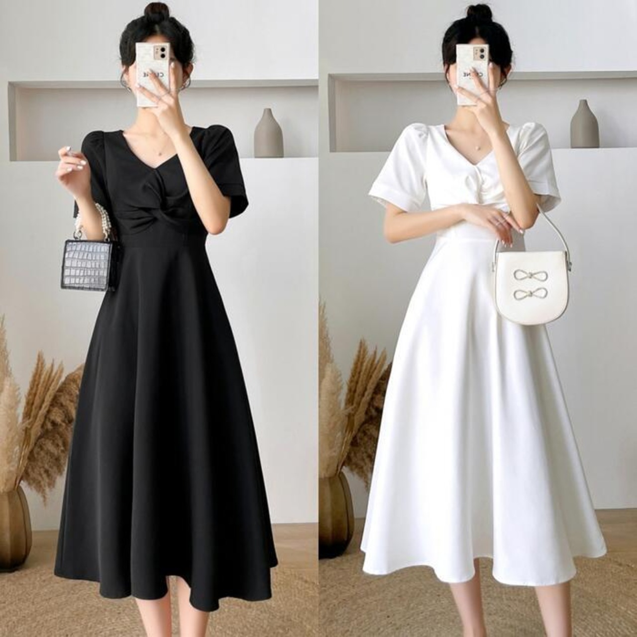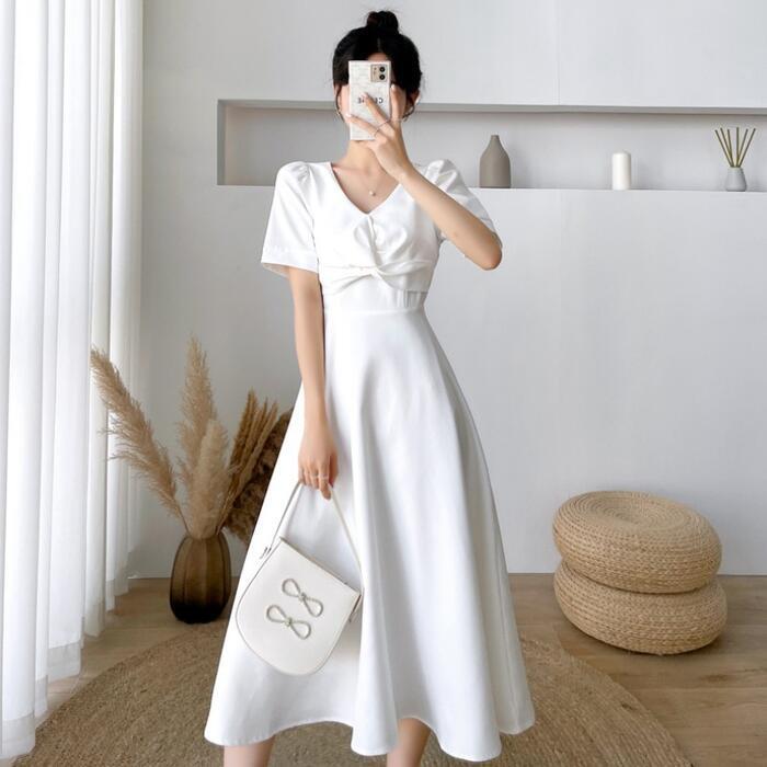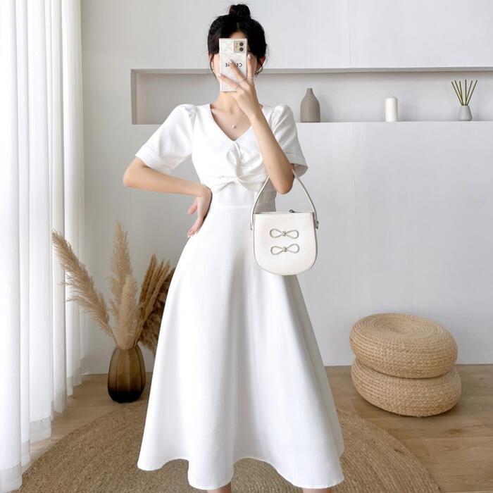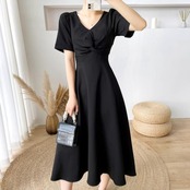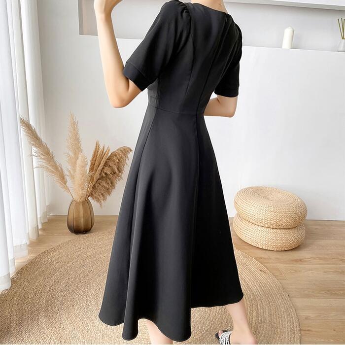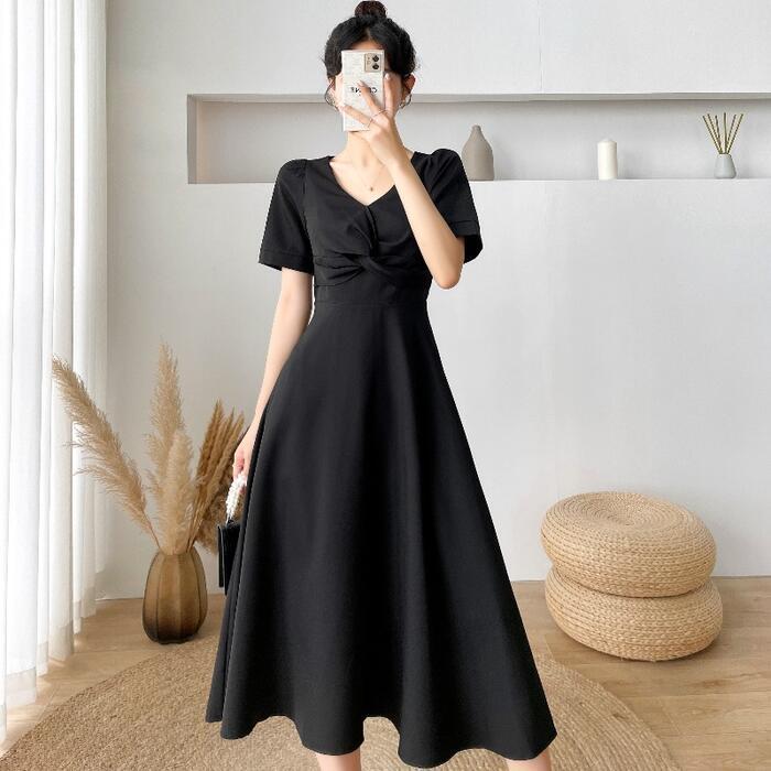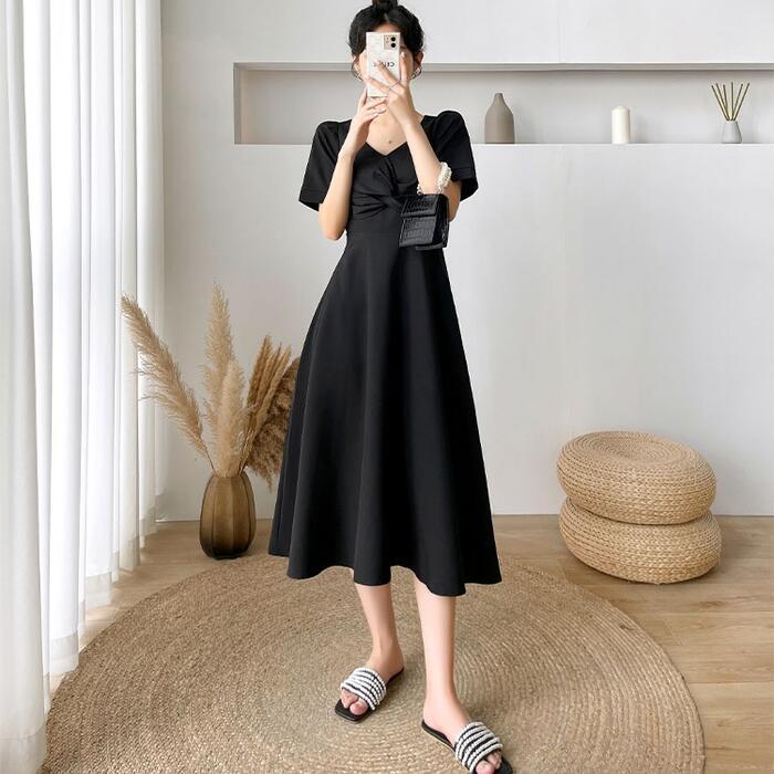 全2色 大きいサイズ結婚式 ワンピース ロングワンピ 袖あり Vネック ミモレ丈 エレガント きれいめ レディース ドレス 半袖 フォーマル セレモニー 発表会 パーティー 大人 可愛い Aライン ホワイト 白 ブラック 黒 春 秋 夏 20代 30代 40代 50代