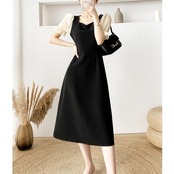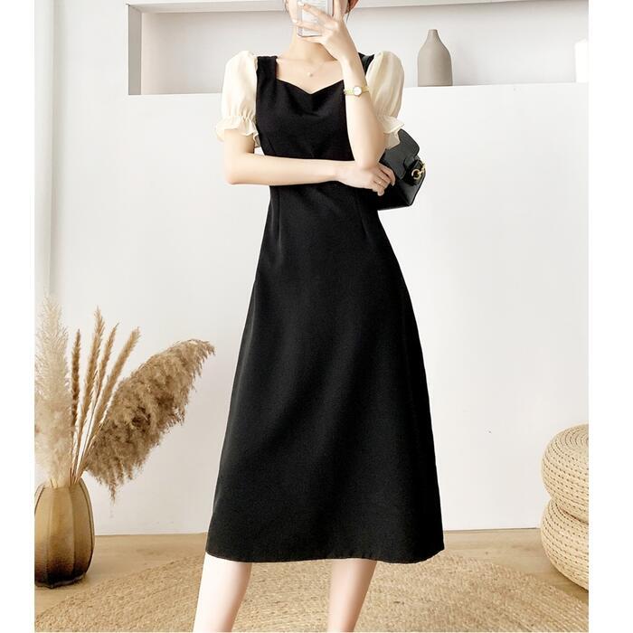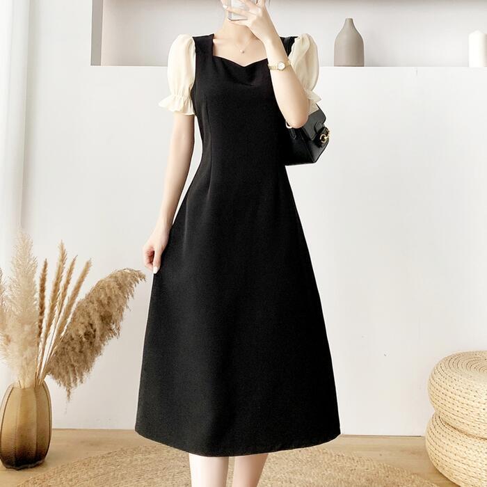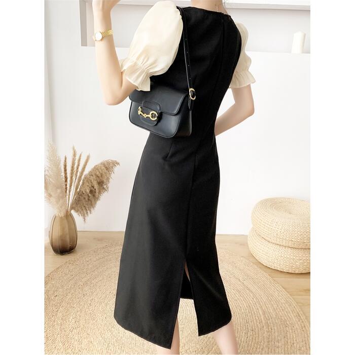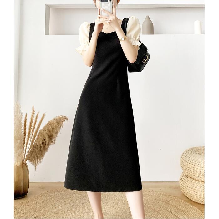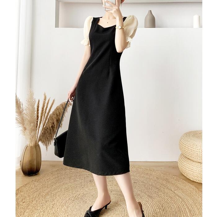 大きいサイズワンピース ロングワンピ バイカラー レディース 袖あり パフスリーブ 配色 半袖 きれいめ カジュアル ミモレ丈 おしゃれ Aライン 体型カバー ナチュラル 大人 可愛い ワンピ ドレス 透け感 ブラック 黒 春 秋 夏 20代 30代 40代 50代