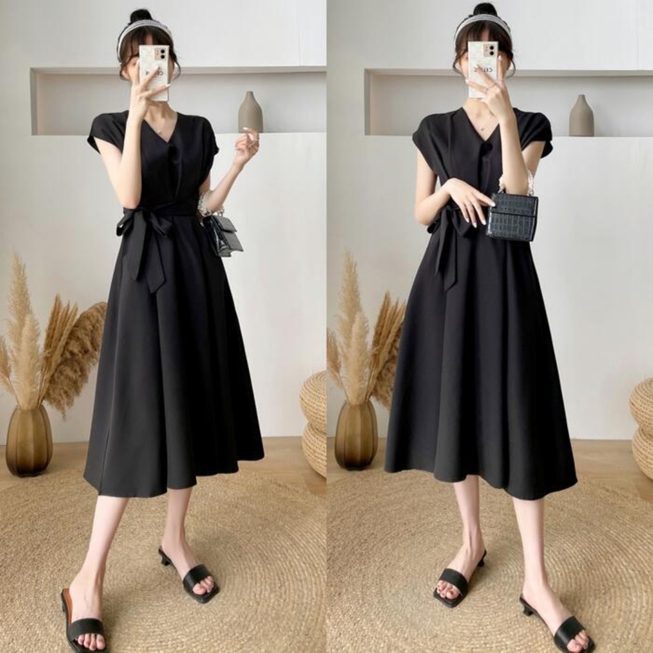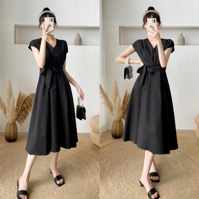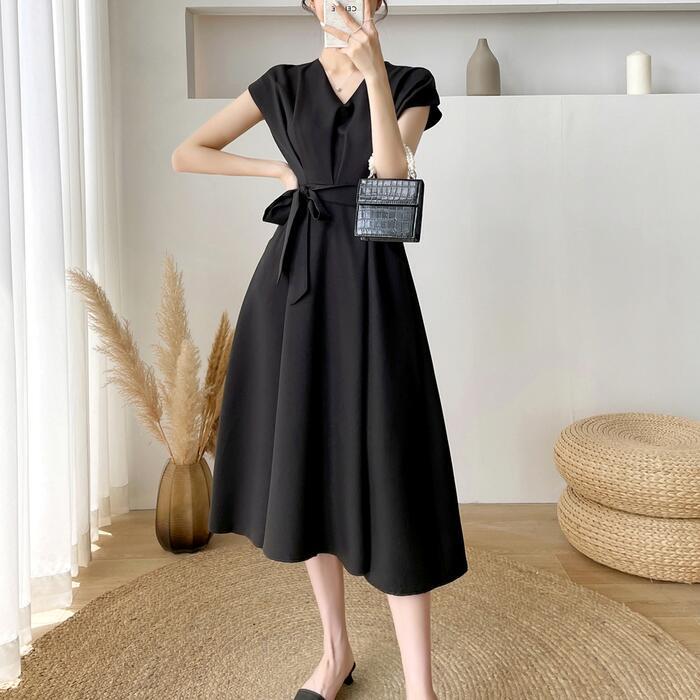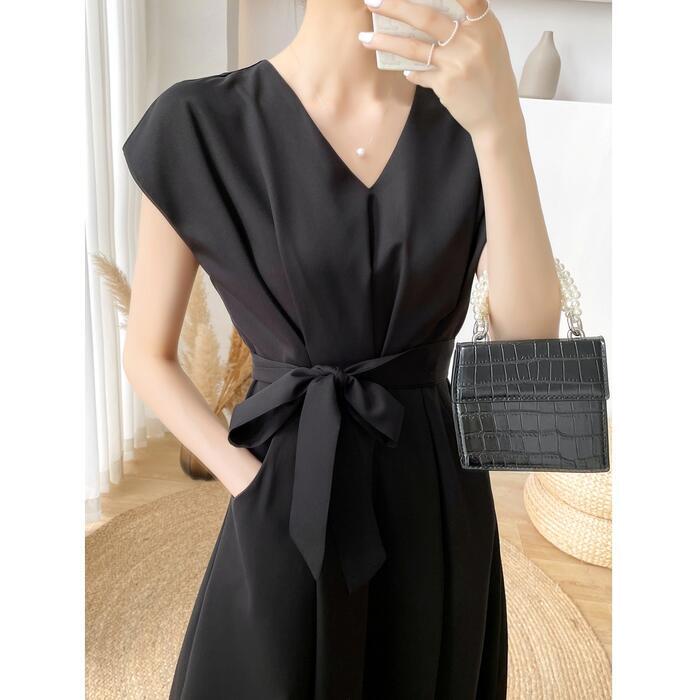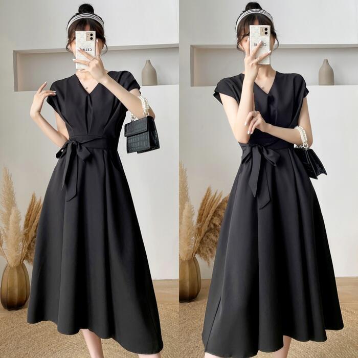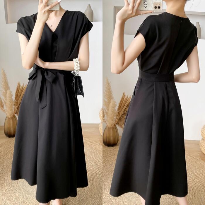 大きいサイズ結婚式 ワンピース ロングワンピ フレンチスリーブ Vネック ミモレ丈 エレガント きれいめ レディース ドレス 半袖 フォーマル セレモニー 発表会 パーティー 大人 可愛い ウエストリボン ブラック 黒 春 秋 夏 20代 30代 40代 50代