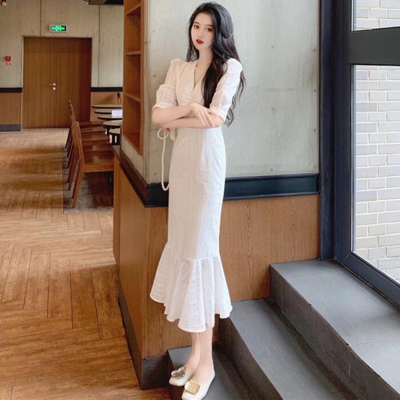 エレガントワンピース ロングワンピ レディース 袖あり パフスリーブ 半袖 きれいめ カジュアル ミモレ丈 マーメイドシルエット おしゃれ タイト Vネック 大人 可愛い ワンピ ドレス ホワイト 白 春 秋 夏 20代 30代 40代 50代