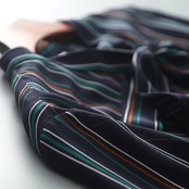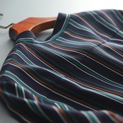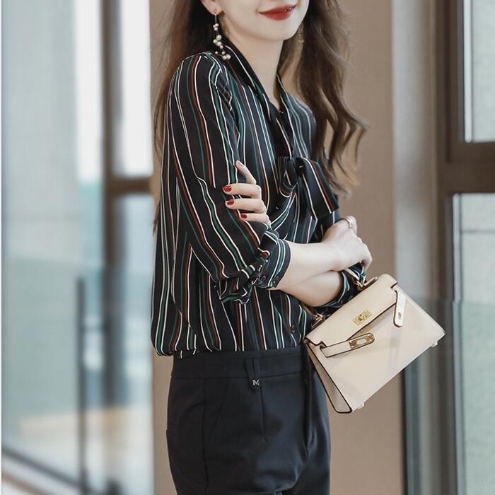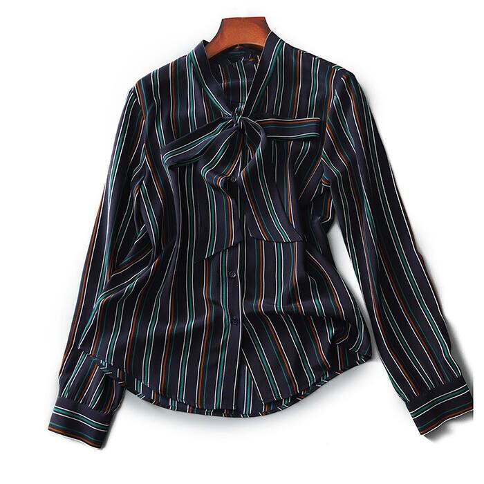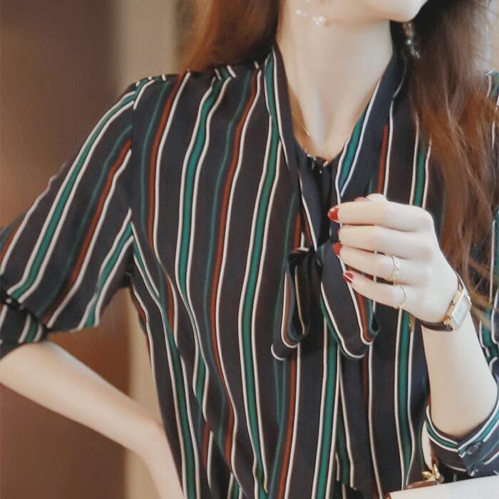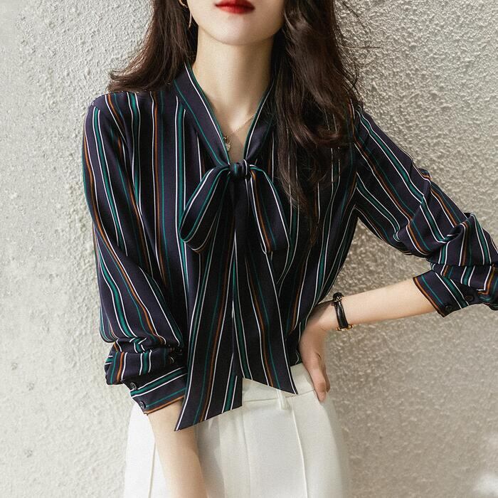 マルチストライプ柄のボウタイブラウス。