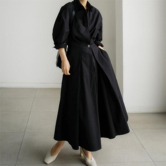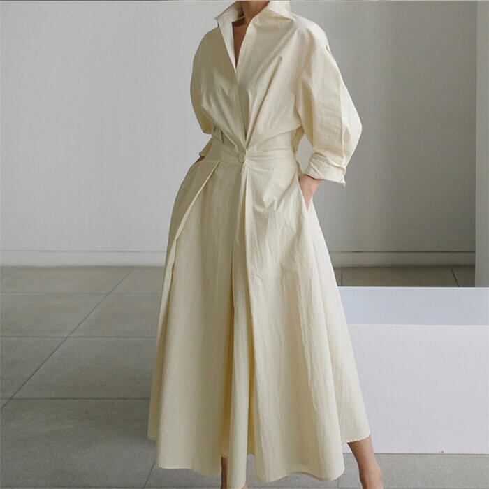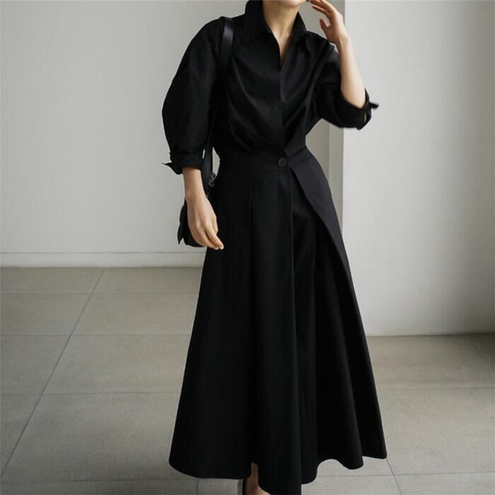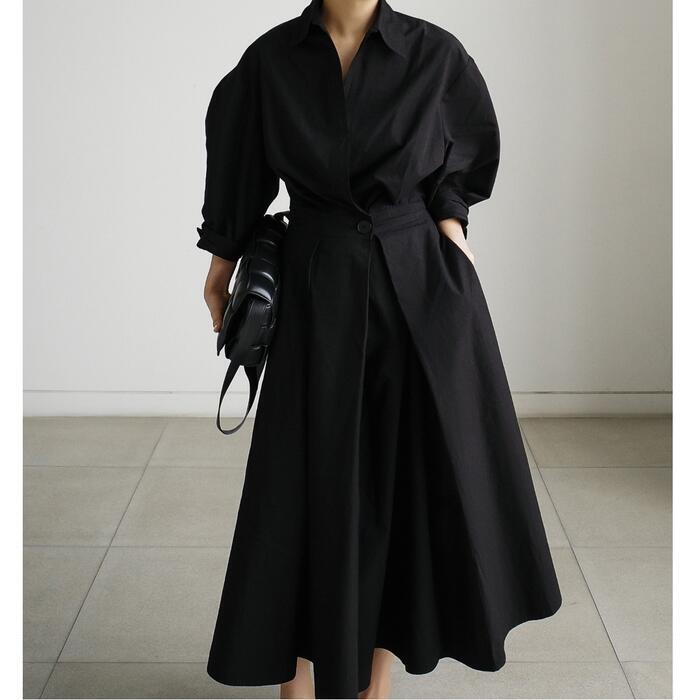全2色 大きいサイズワンピース ロングワンピ レディース 袖あり シャツワンピ きれいめ カジュアル ミモレ丈 七分袖 おしゃれ 大人 可愛い ワンピ ドレス Aライン オフィス フェミニン ハイウエスト ベージュ ブラック 黒 春 秋 夏 20代 30代 40代 50代