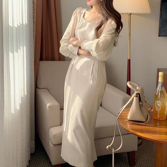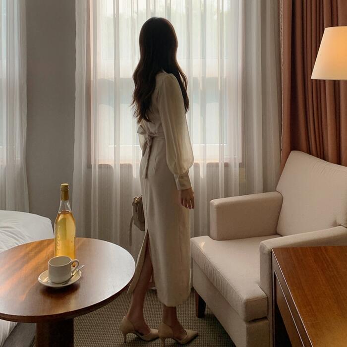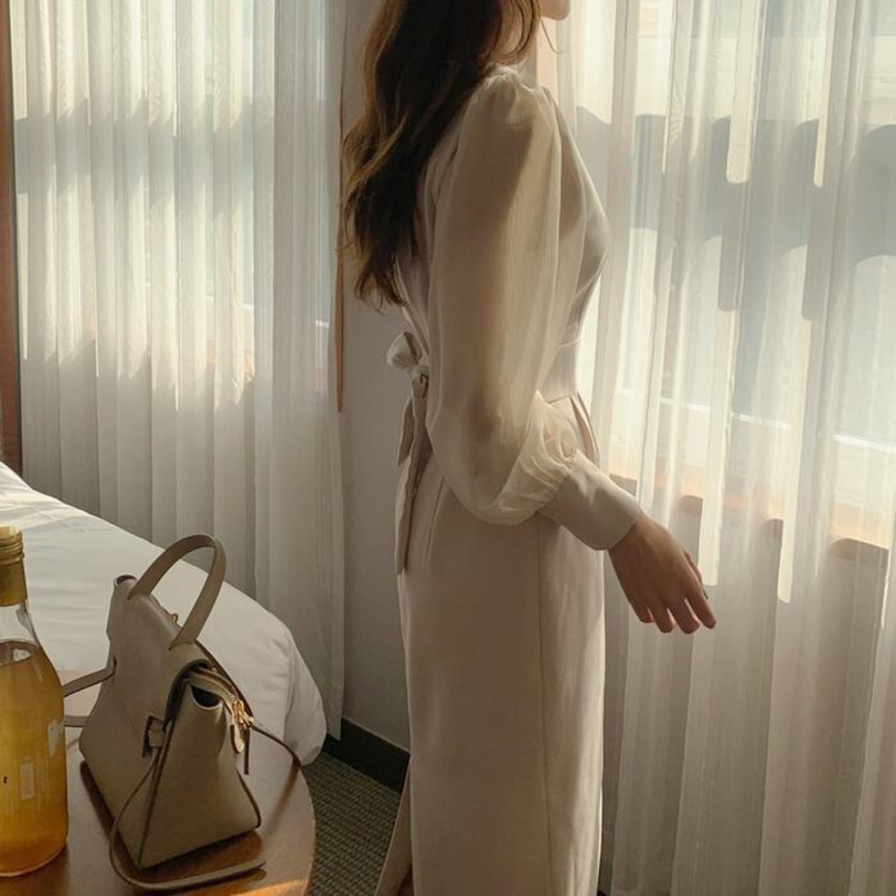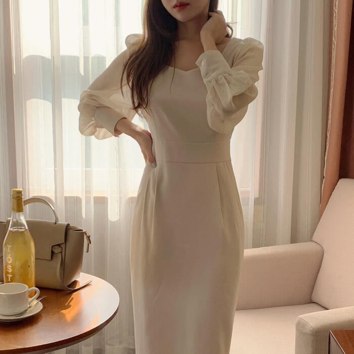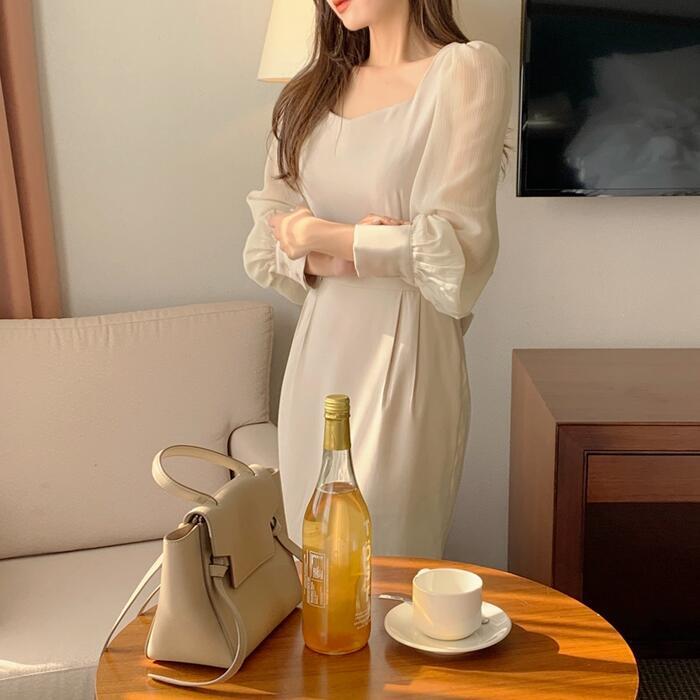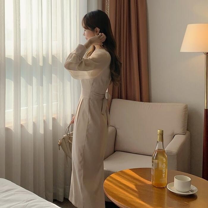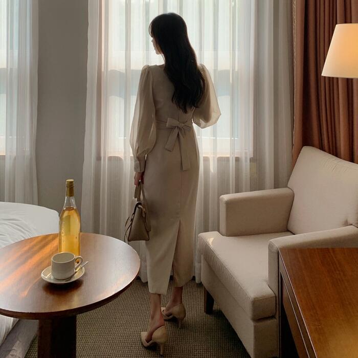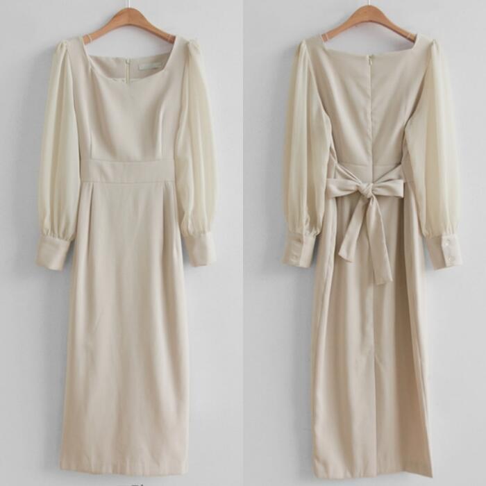 大きいサイズ結婚式 ワンピース ロングワンピ パフスリーブ 透け感 ミモレ丈 エレガント きれいめ レディース ドレス 長袖 タイト フォーマル セレモニー 発表会 パーティー 大人 可愛い ウエストリボン ベージュ 春 秋 夏 20代 30代 40代 50代