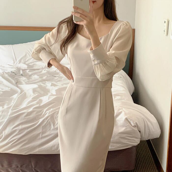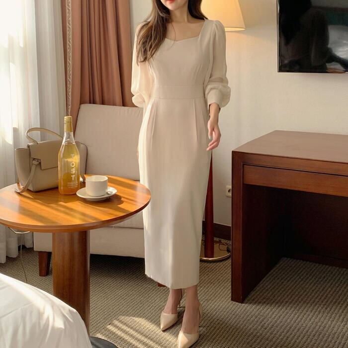 ハイウエストで切り替えたタイトシルエットのワンピース。