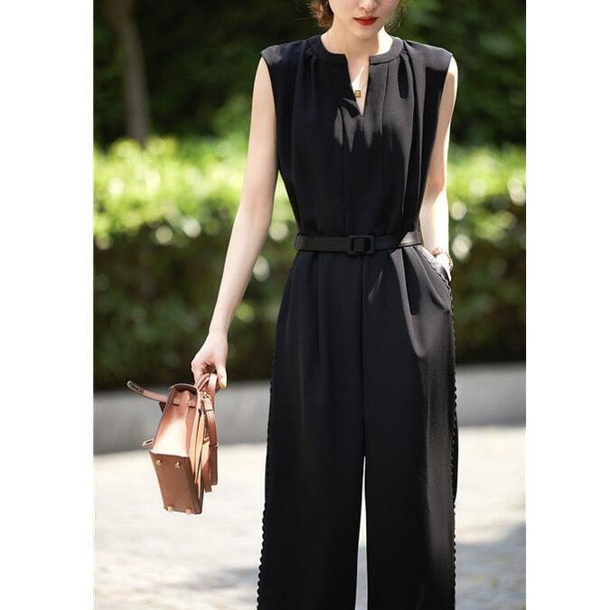 全2色 大きいサイズオールインワン サロペット ジャンプスーツ コンビネゾン ノースリーブ ワイドパンツ ロング丈 レディース ロングパンツ ドレス 大人可愛い ハイウエスト ウエストベルト きれいめ カジュアル ベージュ ブラック 黒 春 秋 夏 20代 30代 40代 50代