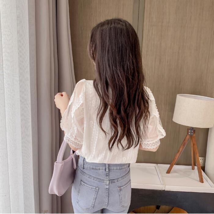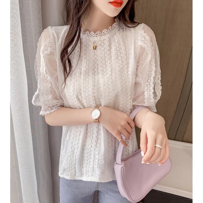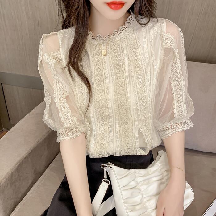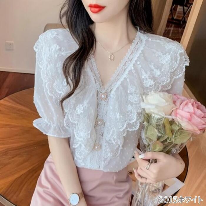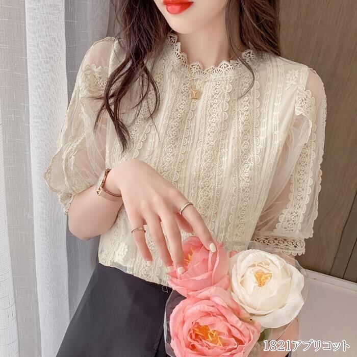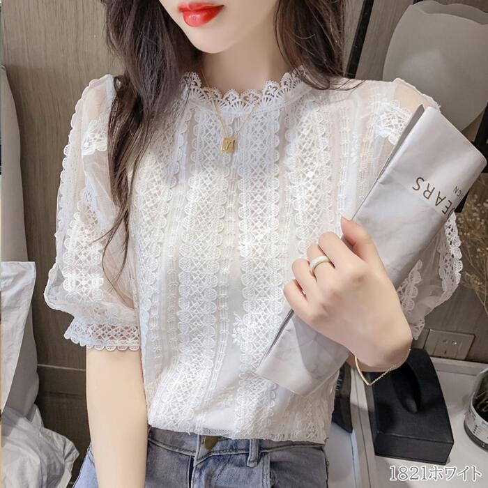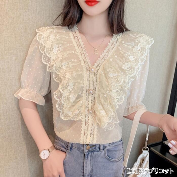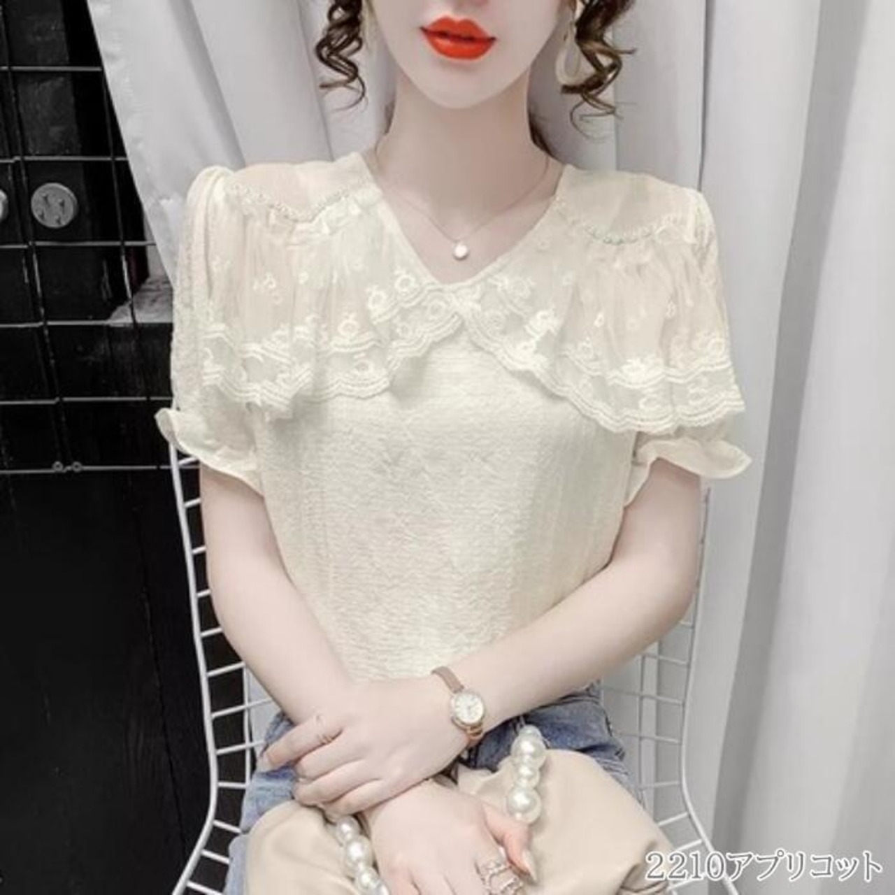 全3種2色 大きいサイズ 透け感 フェミニン ナチュラルトップス レディース きれいめ カジュアル おしゃれ 薄手 カットソー ブラウス レース 刺繍 シャツ 五分袖 半袖 パフスリーブ Vネック 大人 可愛い 上品 韓国 コーデ ベージュ ホワイト 白 春 夏 秋 20代 30代 40代 50代