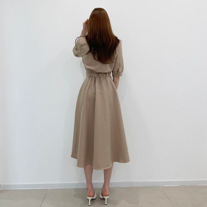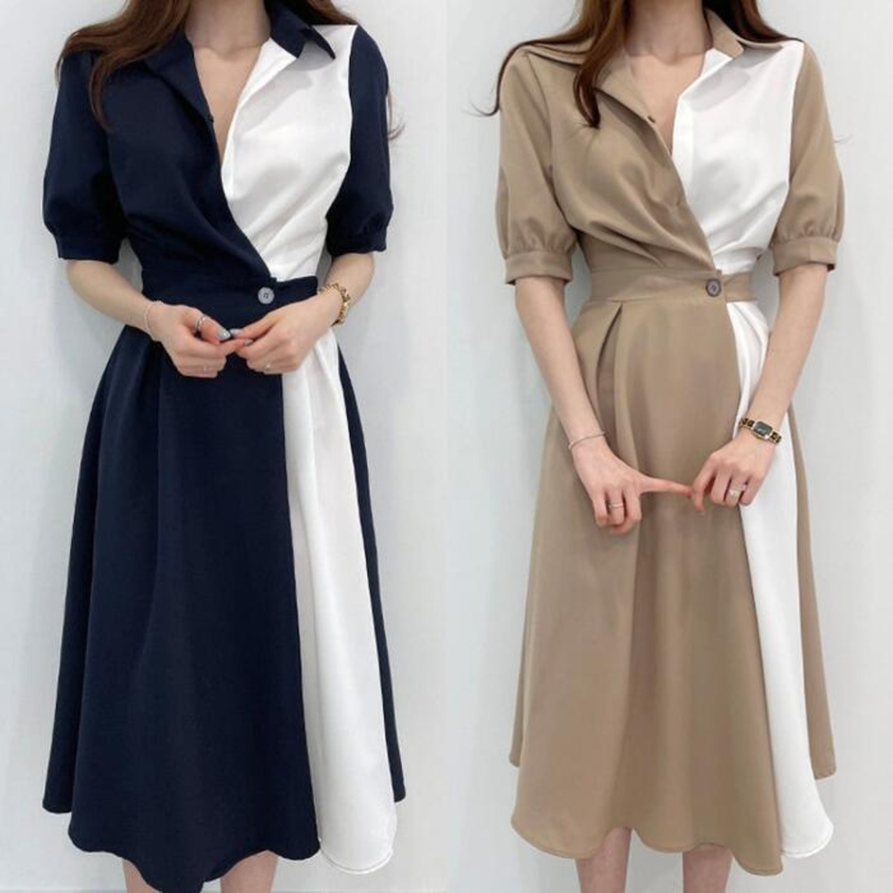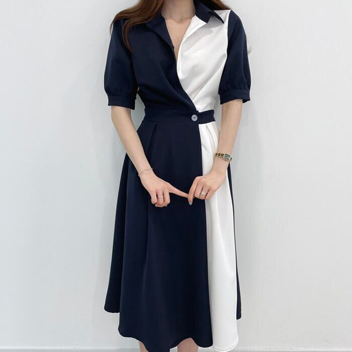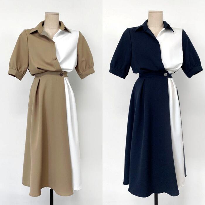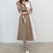 全2色 ワンピース ロングワンピ 袖あり 配色 バイカラー レディース エレガント きれいめ カジュアル ミモレ丈 五分袖 おしゃれ 大人 可愛い ワンピ ドレス シャツワンピ フェミニン ベージュ ブルー 春 秋 夏 20代 30代 40代 50代