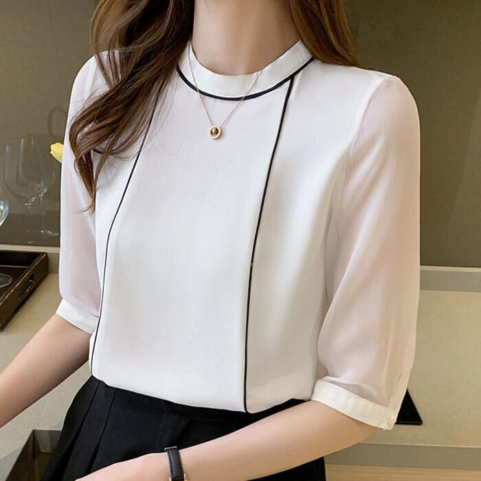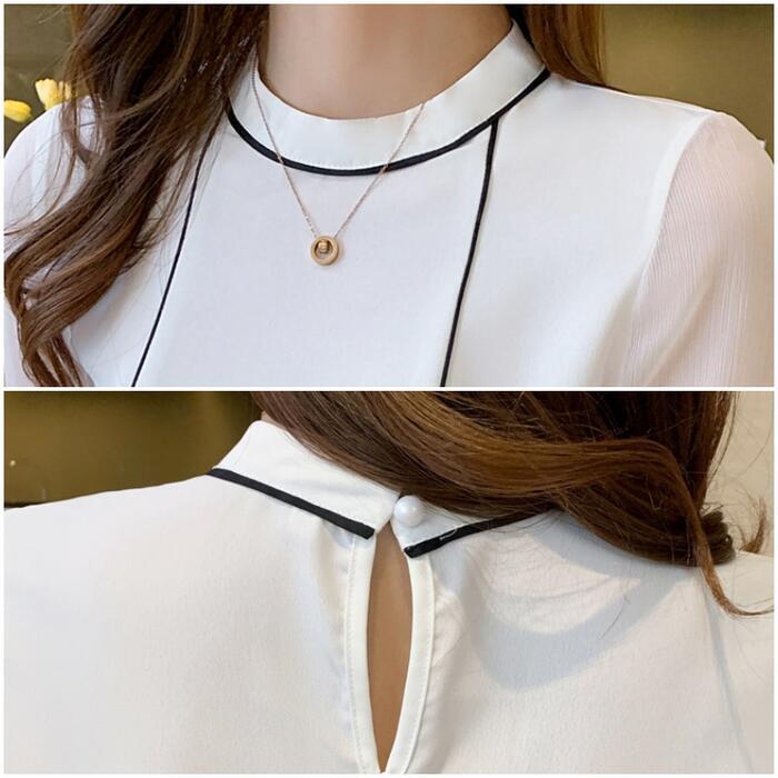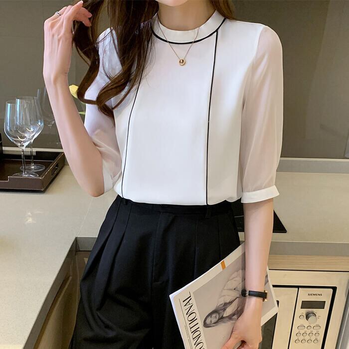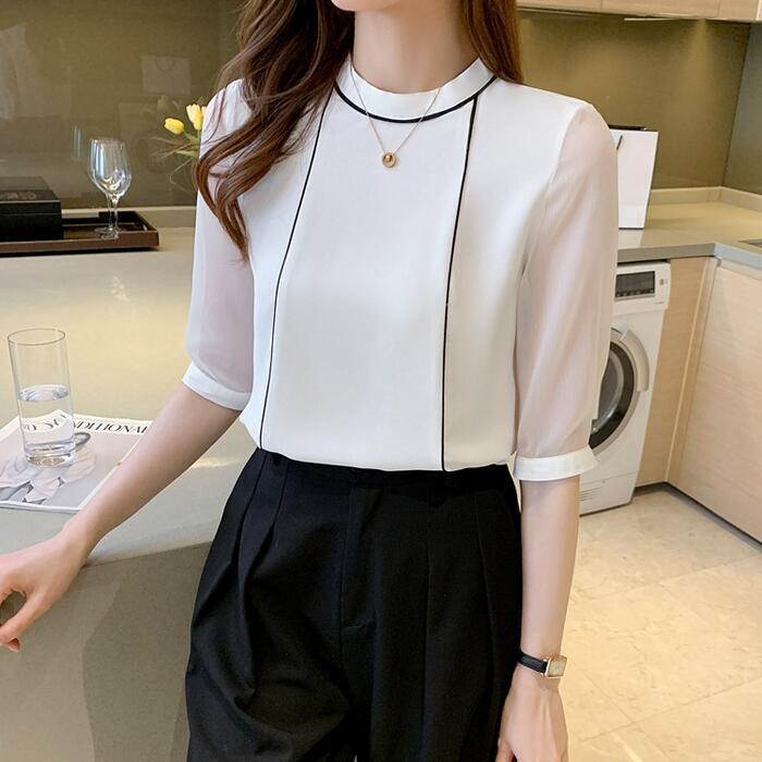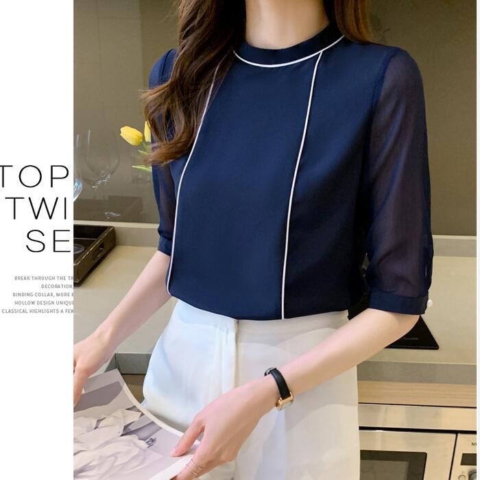 全2色 大きいサイズトップス シャツ ブラウス パイピング 配色 半袖 クルーネック レディース きれいめ カジュアル 五分袖 シアー 透け感 おしゃれ 上品 大人 可愛い フェミニン エレガント ホワイト 白 ネイビー 春 夏 秋 20代 30代 40代 50代