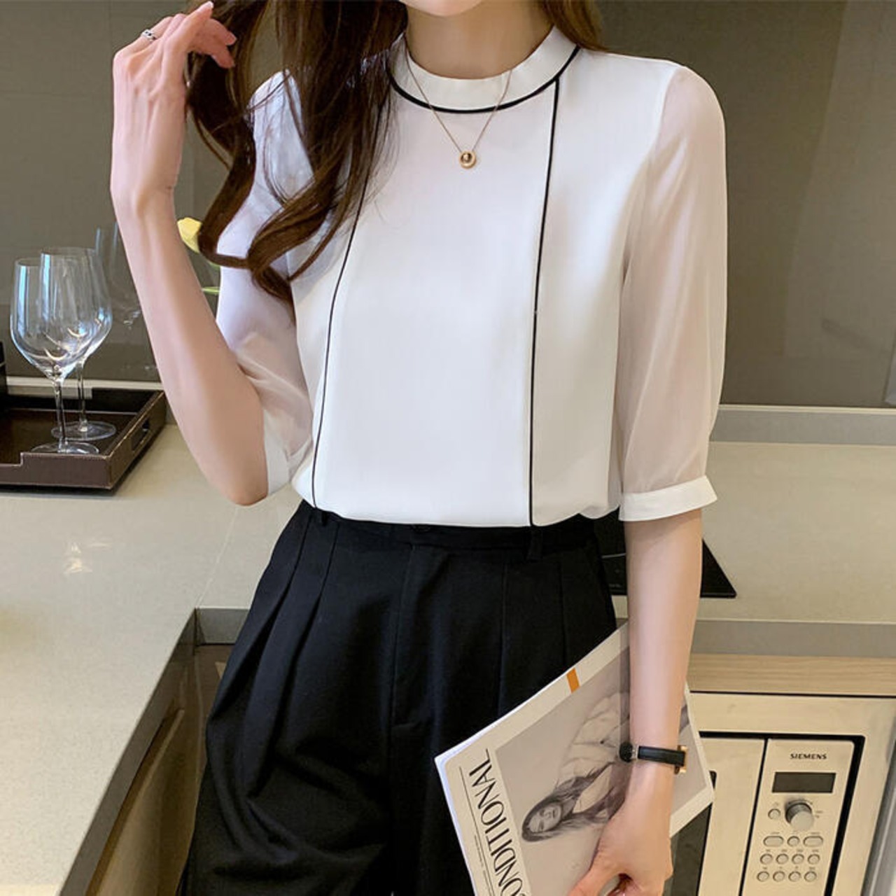 パイピングがアクセントになった五分袖ブラウス。