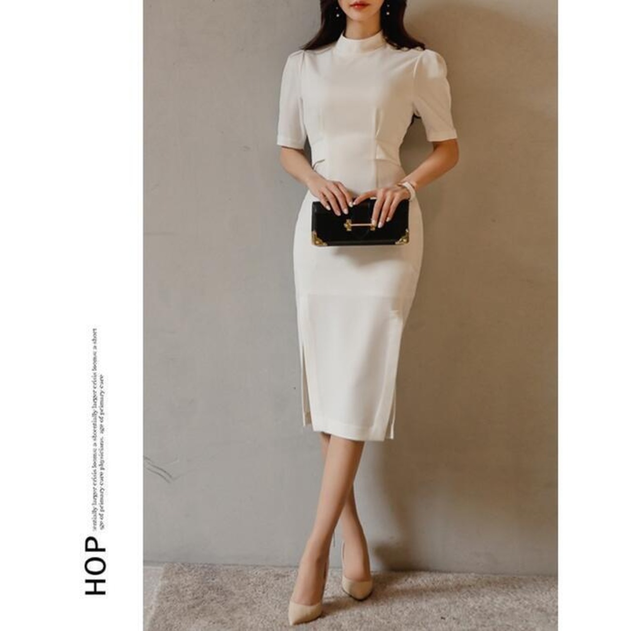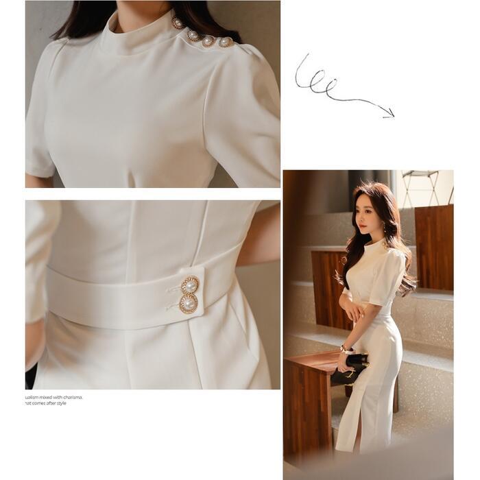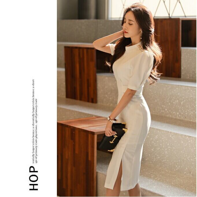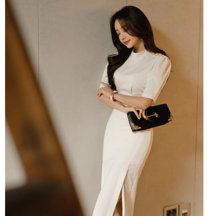 大きいサイズワンピース ロングワンピ 袖あり ハイネック エレガント レディース きれいめ カジュアル ミモレ丈 半袖 おしゃれ 大人 可愛い ワンピ ドレス スリム タイト 高見え お呼ばれ フェミニン ホワイト 白 春 秋 夏 20代 30代 40代 50代