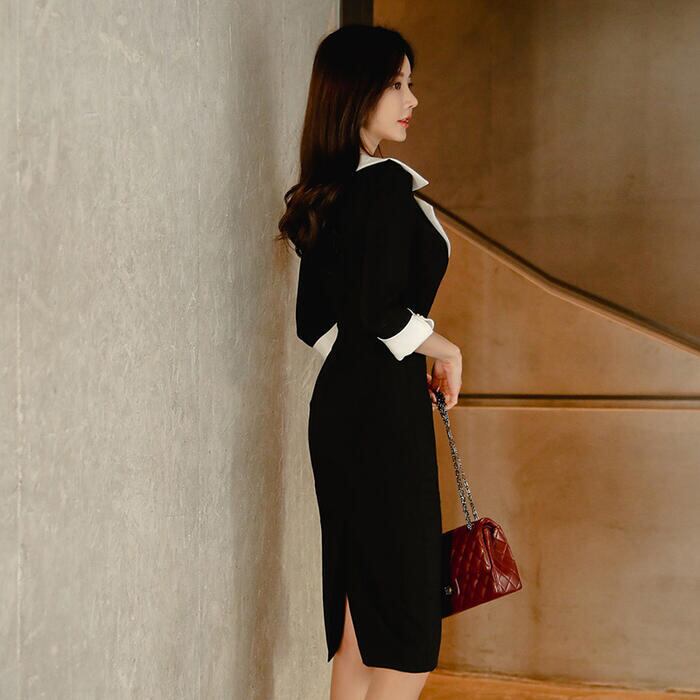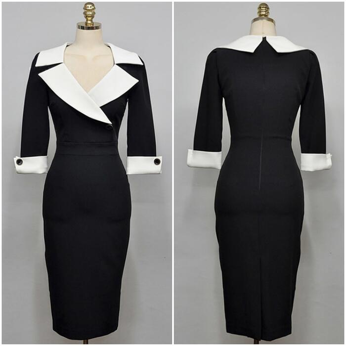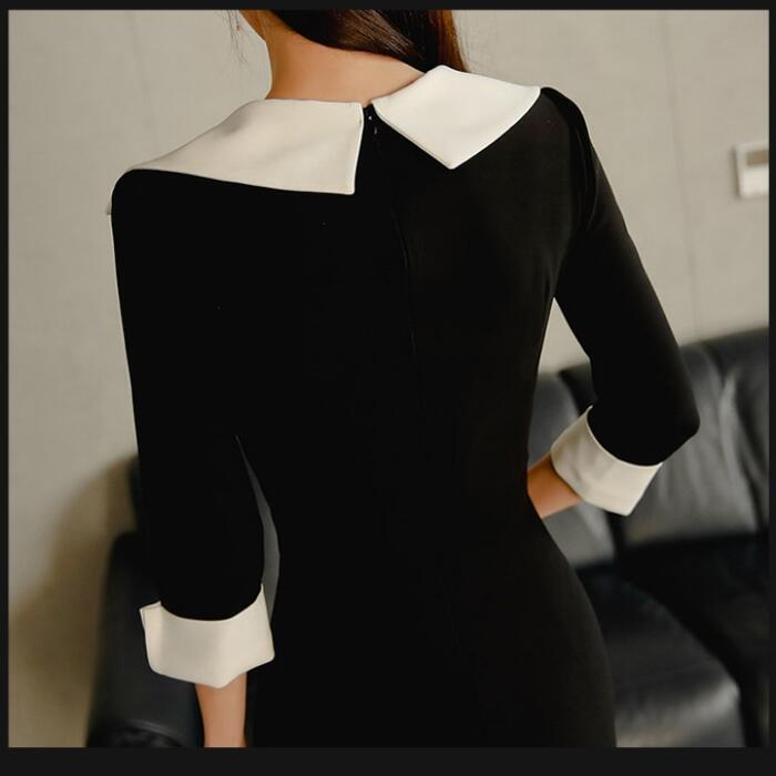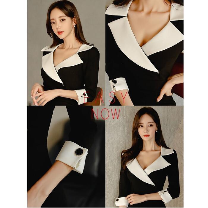 大きいサイズワンピース ロングワンピ 袖あり ビッグカラー Vネック 七分袖 エレガント バイカラー レディース きれいめ カジュアル ミモレ丈 おしゃれ 大人 可愛い ワンピ ドレス タイト 高見え お呼ばれ フェミニン ブラック 黒 春 秋 夏 20代 30代 40代 50代
