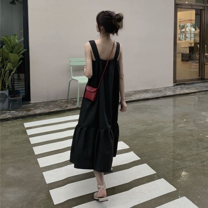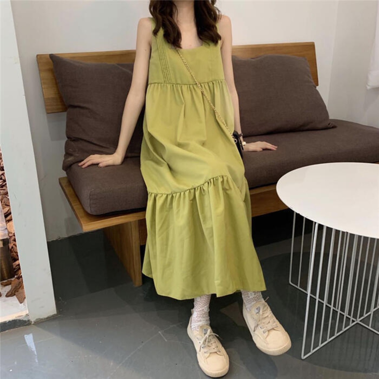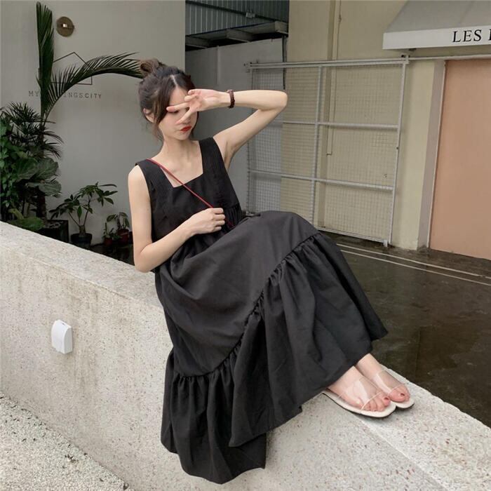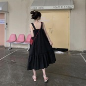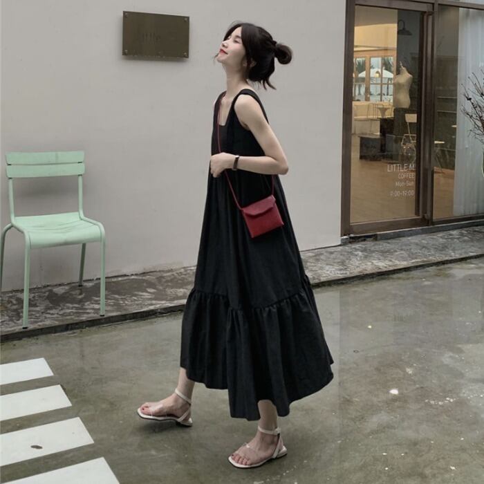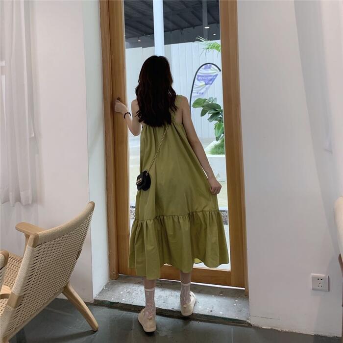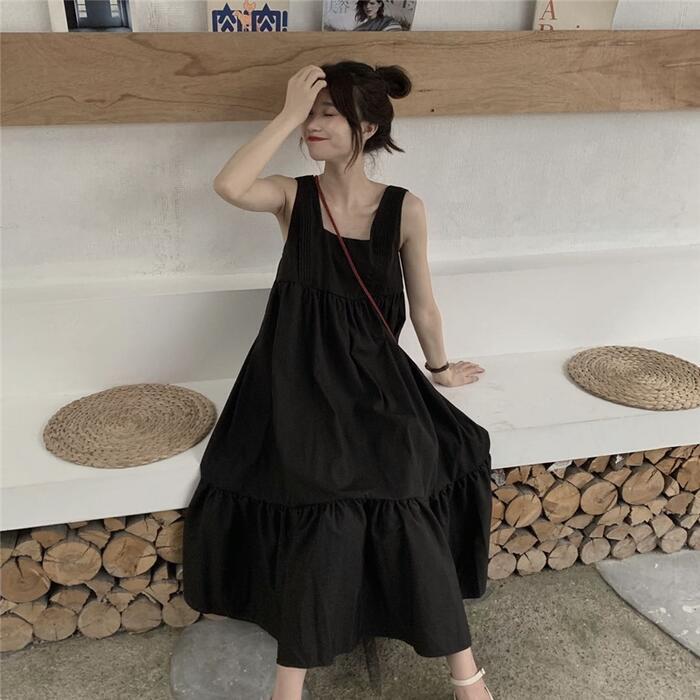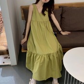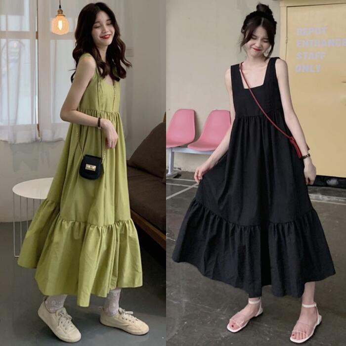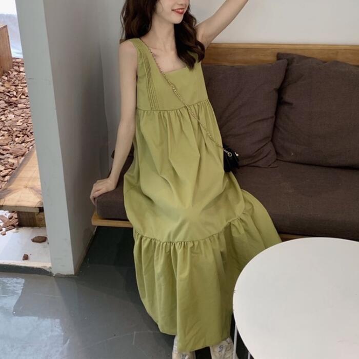 全2色 ティアード ワンピース ロングワンピ きれいめ カジュアル ノースリーブ ミモレ丈 スクエアネック おしゃれ レディース 大人 可愛い ゆったり 体型カバー ワンピ ドレス ナチュラル グリーン 緑 ブラック 黒 春 秋 夏 20代 30代 40代 50代