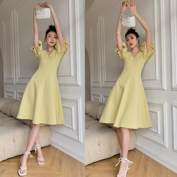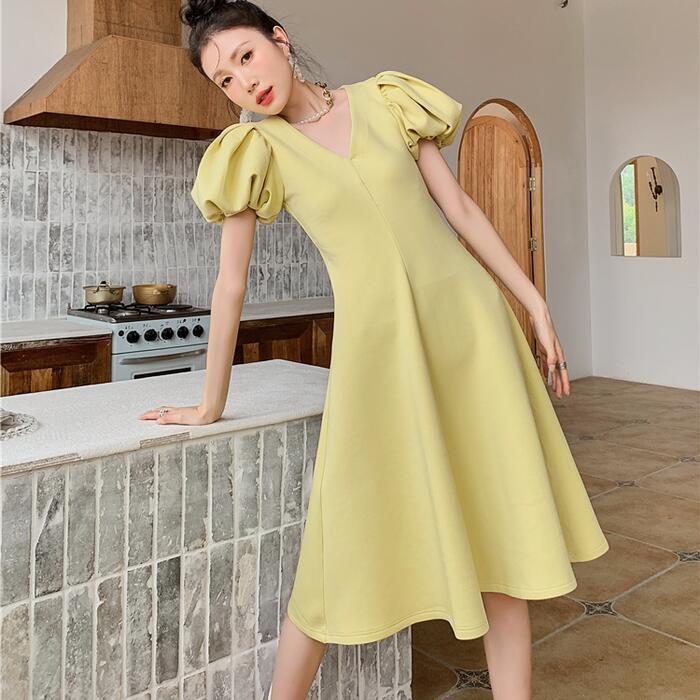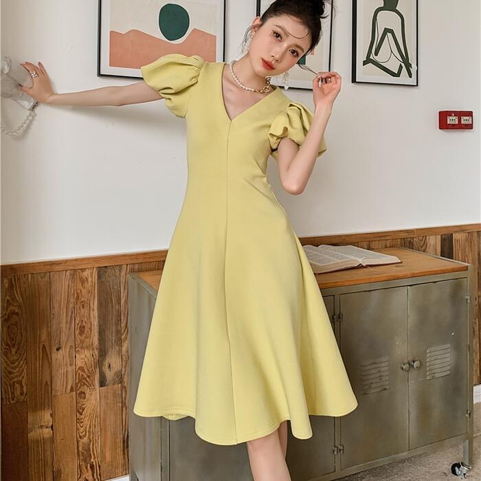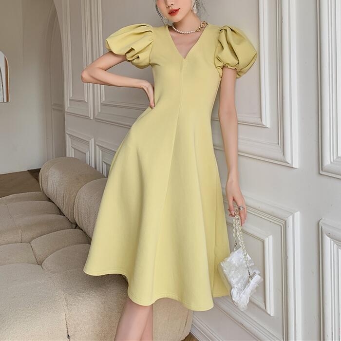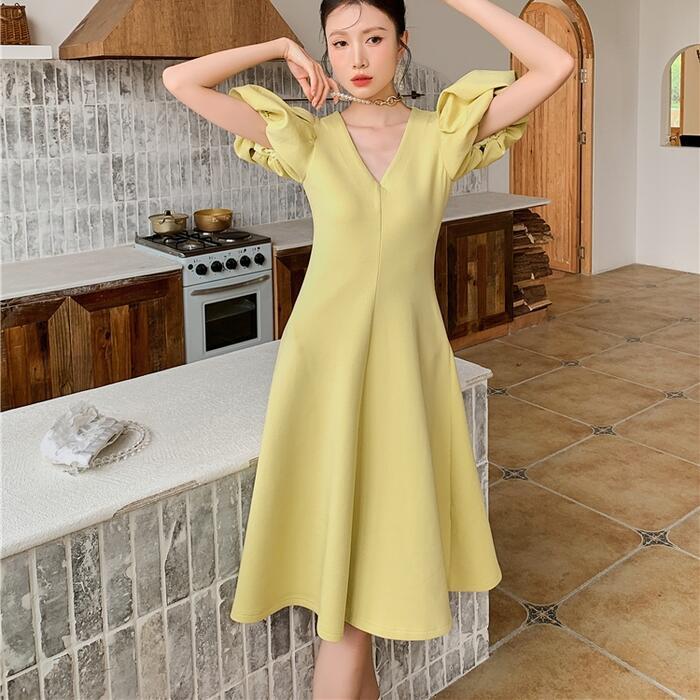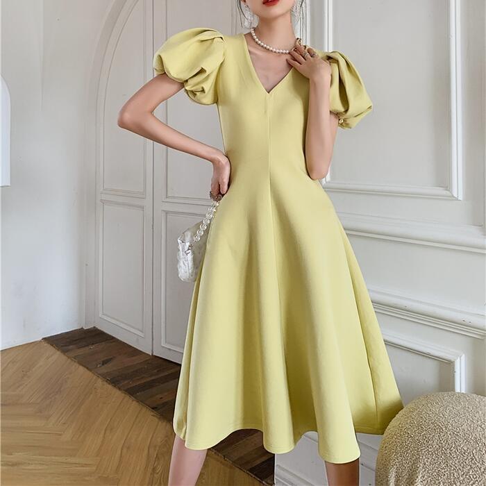 大きいサイズ結婚式 ワンピース ロングワンピ パフスリーブ Vネック ミモレ丈 エレガント きれいめ レディース ドレス 半袖 フォーマル セレモニー 発表会 パーティー 大人 可愛い Aライン イエロー 春 秋 夏 20代 30代 40代 50代